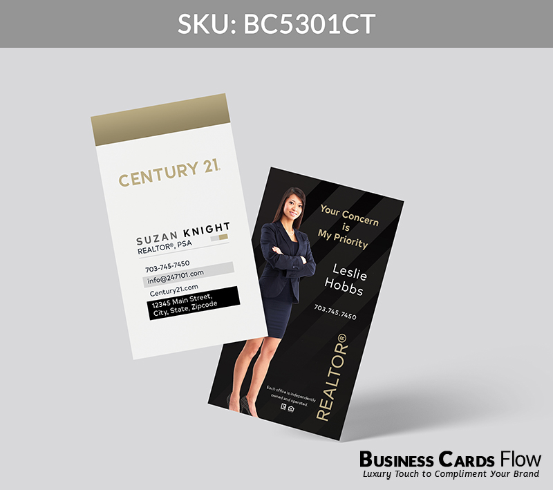 Designed for the Century 21 agent who values distinction and lasting impact, this vertical card exudes modern professionalism while reinforcing personal brand identity at every touchpoint. Enhanced with elegant Gold, Grey, and White tones, it visually aligns your image with Century 21’s trusted legacy of excellence.