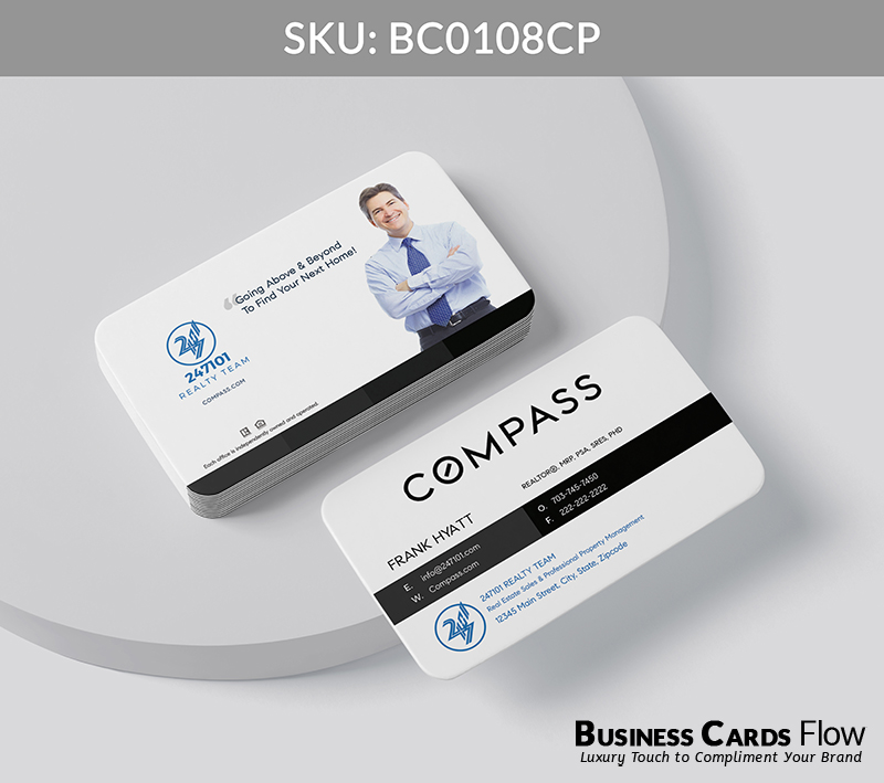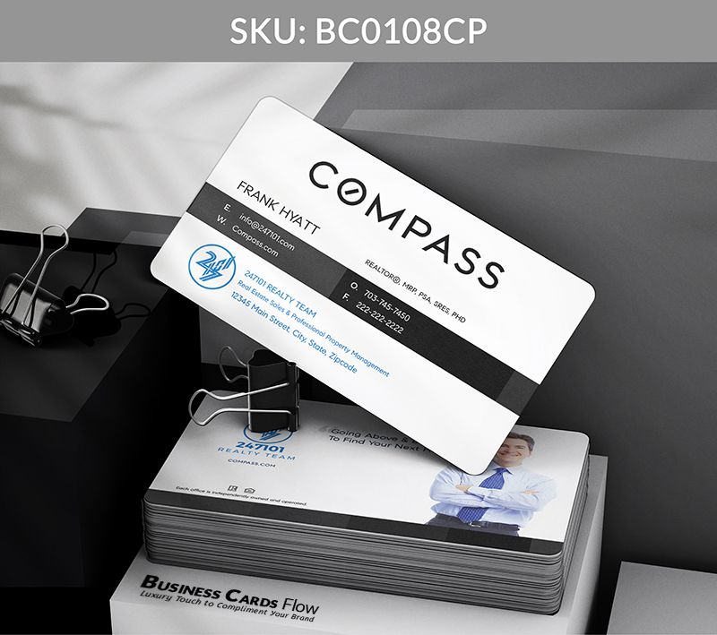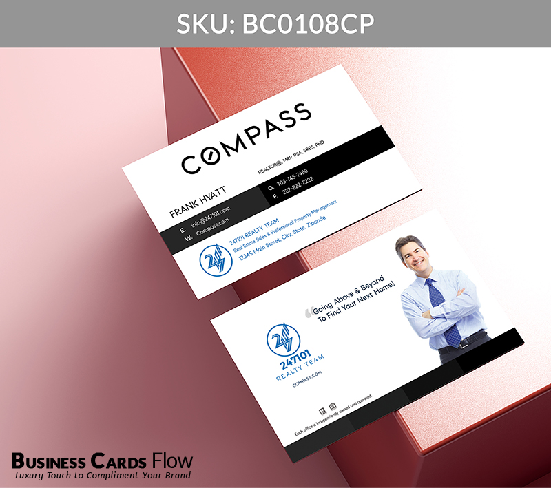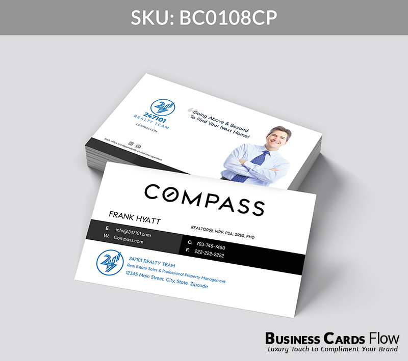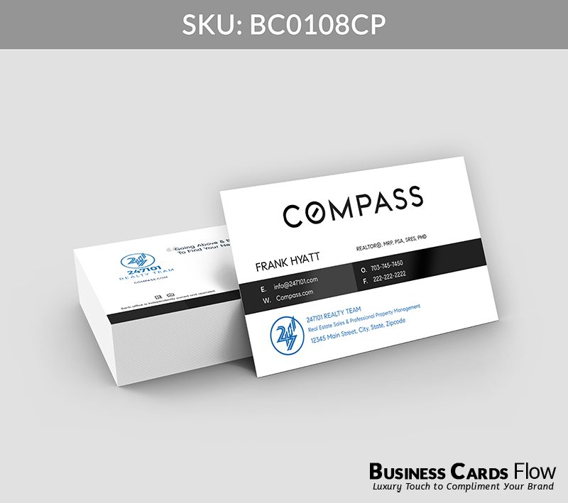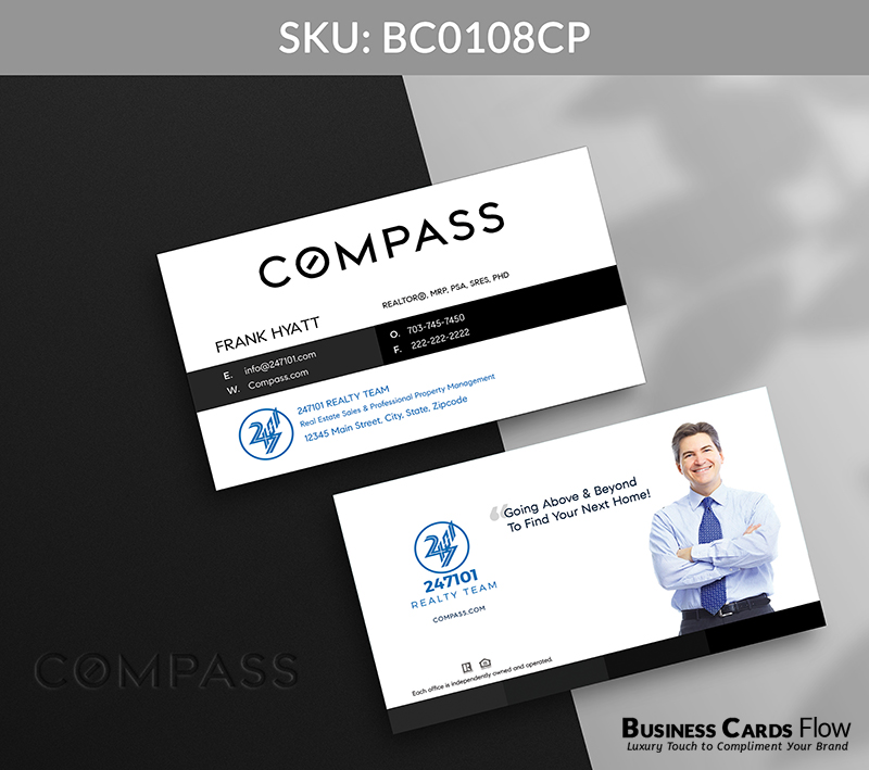 Black and white Compass-branded color business card with space to feature your team’s contact information prominently on the front. The reverse side offers flexibility to include a team logo, a meaningful quote, a professional headshot, or any element that reflects your unique brand identity.