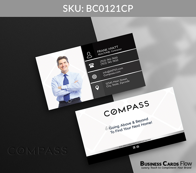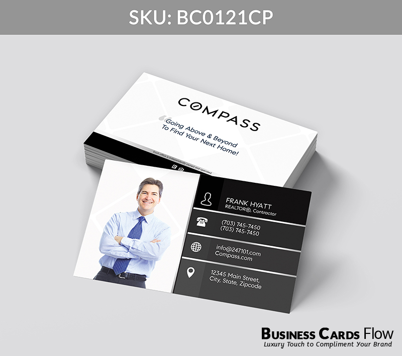 This card design speaks with quiet confidence — pairing visual clarity with a personalized touch that leaves a lasting impression. With the Compass logo standing strong in monochrome elegance, every element echoes the professionalism and polish expected from top-tier real estate advisors.