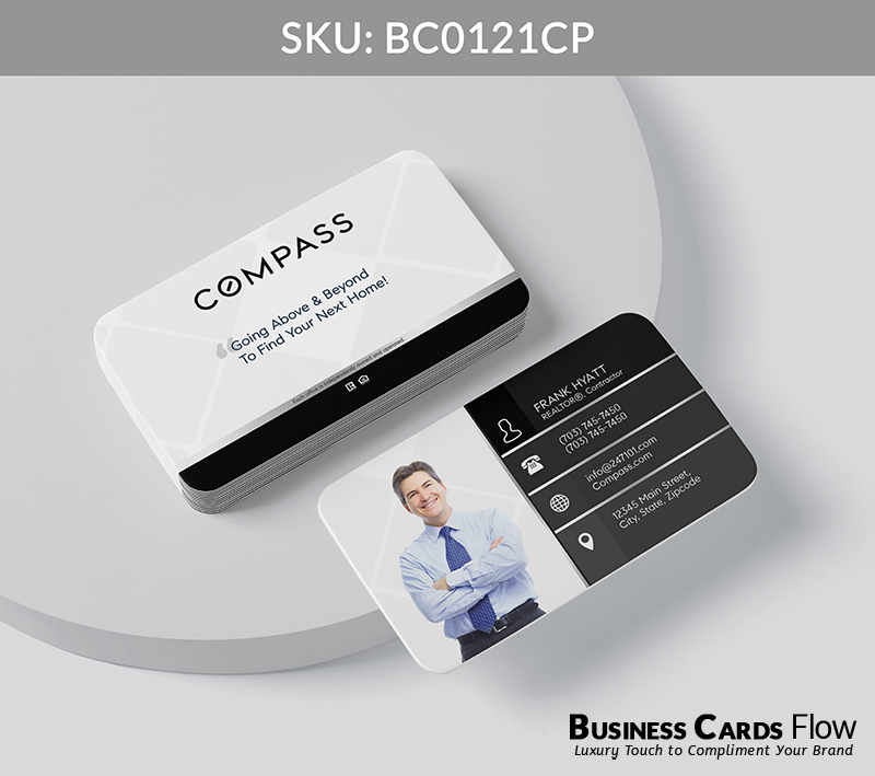 A sleek profile photo is positioned on the left side of the business card, while all essential contact information is presented cleanly and professionally on the right. The reverse side features the Compass logo prominently, with a dedicated space beneath for a quote or slogan that reflects the agent’s personal ethos.