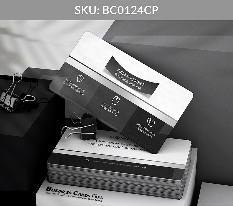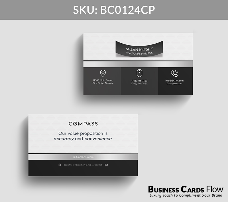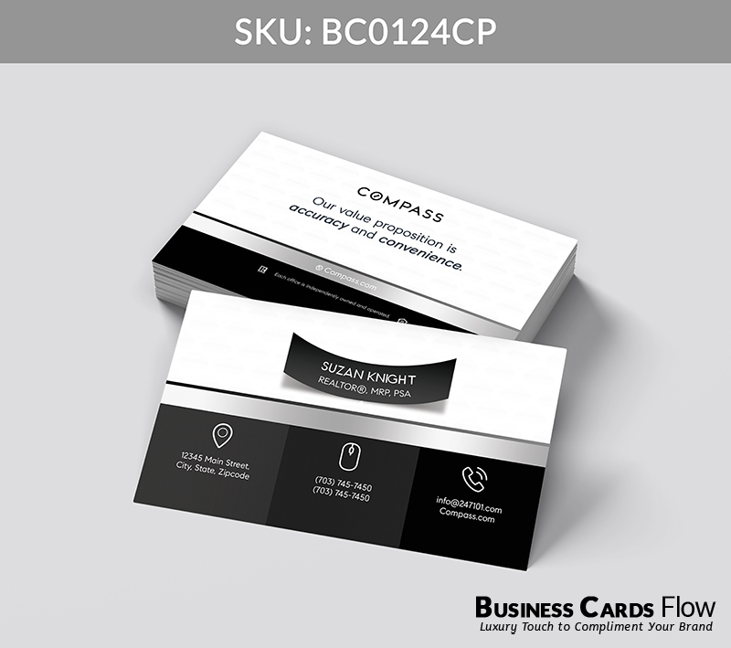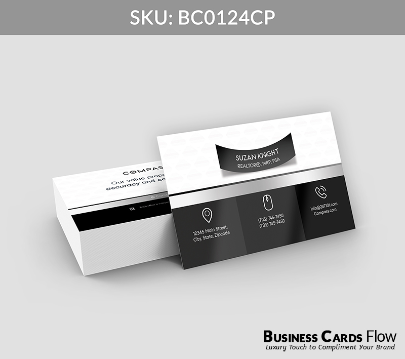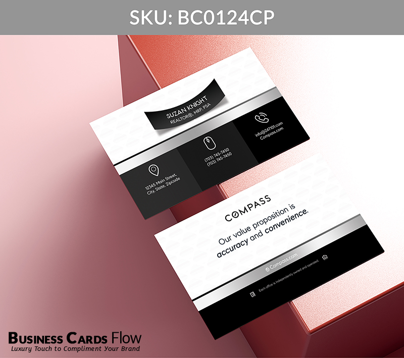 Crafted for agents who lead with impact and clarity, this card design combines dimensional elegance with purposeful layout. The 3D name ribbon becomes a signature element — elevated by Compass’s timeless Black, White, and Gray tones — turning a simple introduction into a bold brand impression.