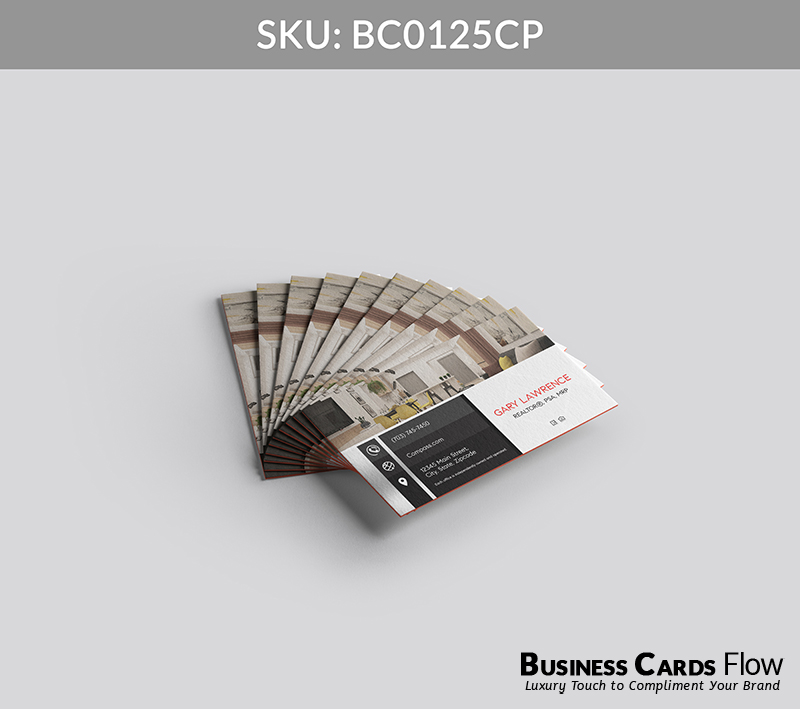 Gorgeous layout featuring a house photo at the top of the business card. The agent’s contact information is prominently positioned on the left side, while the agent’s name is displayed separately on the right side of the card.
