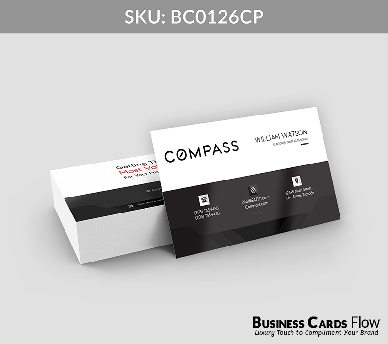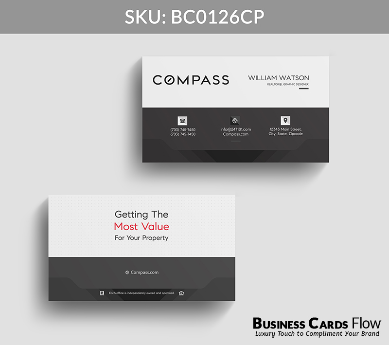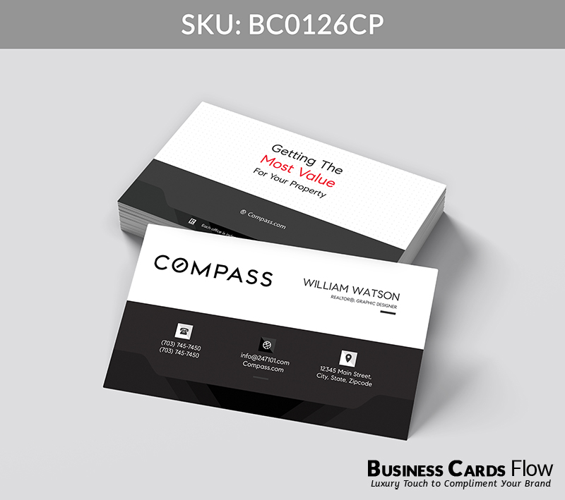 Striking black-and-white split business cards featuring branding-style content at the top and contact information at the bottom. The reverse side offers the option to display your personal website link or the Compass.net link.