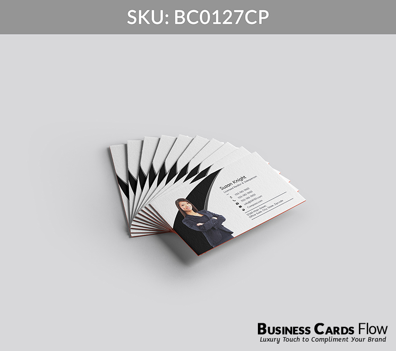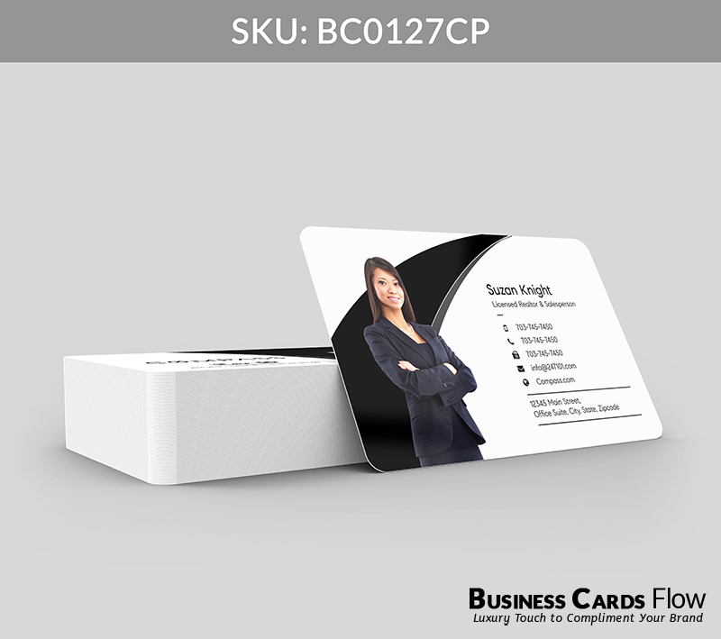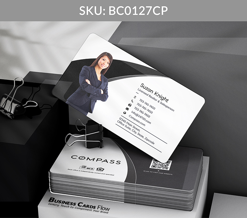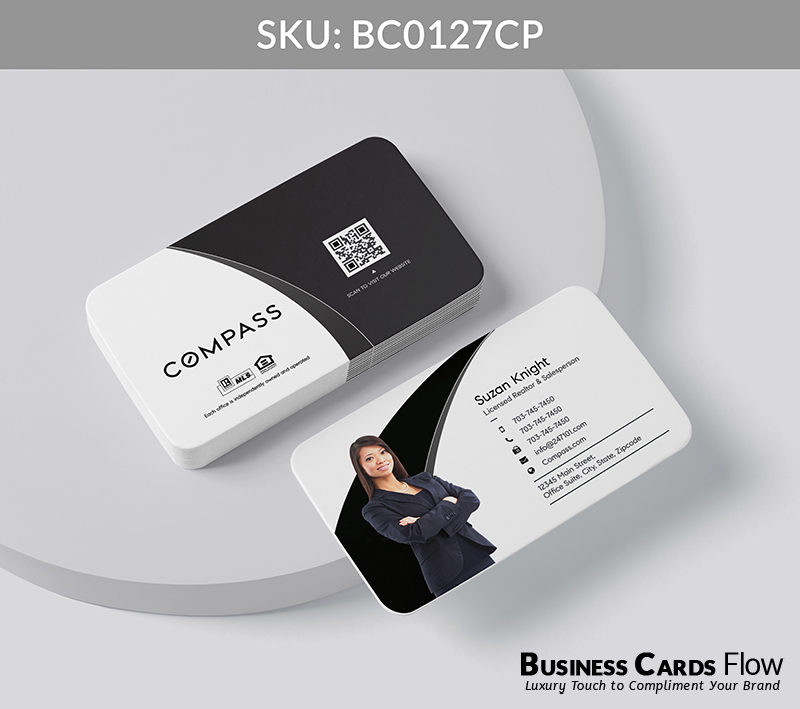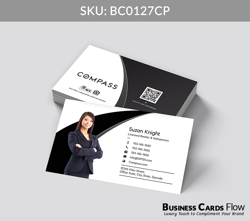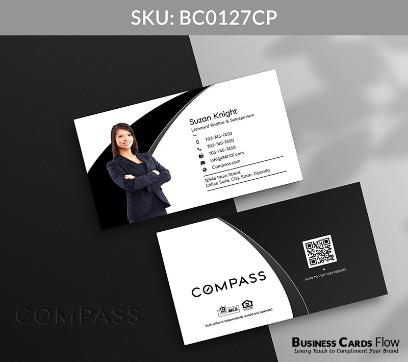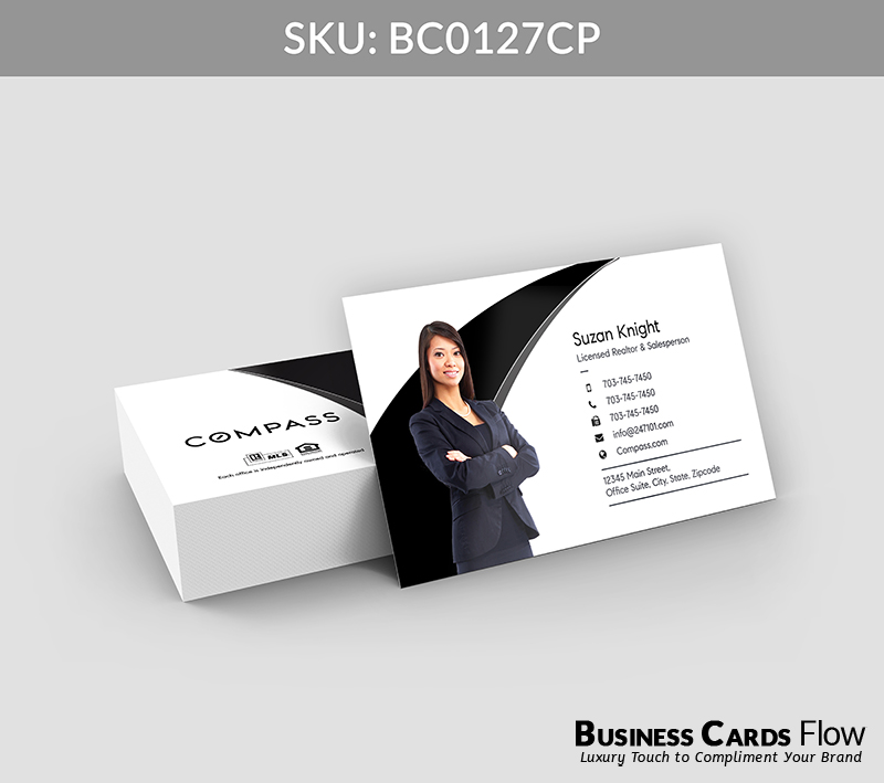 This elegant card design features a silhouette-style image on the left side with a refined design as the background. It beautifully complements a professional headshot with no background, while the right side presents clean, organized contact information. The back side includes the Compass logo along with a personalized or standard slogan.