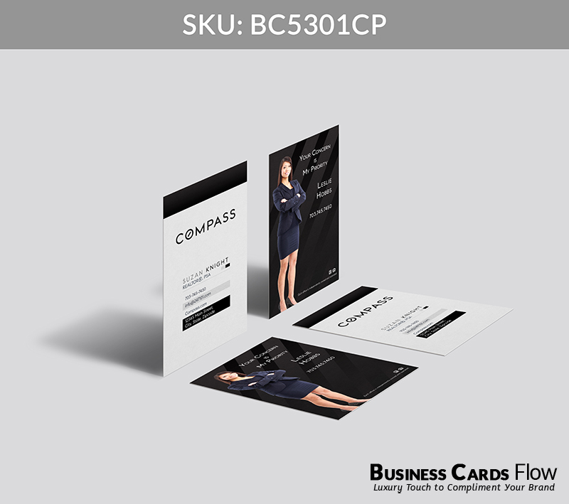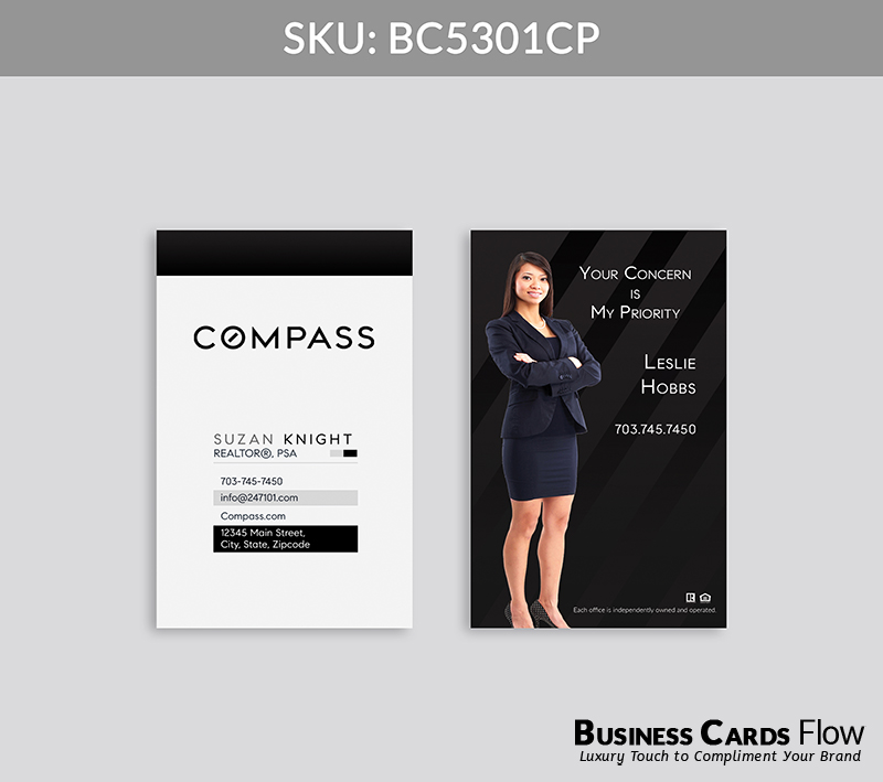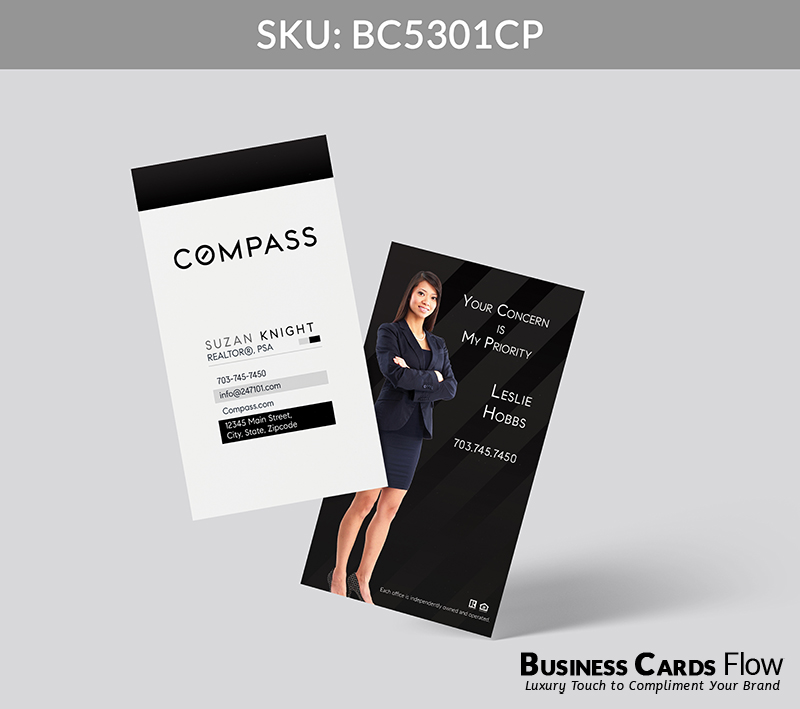 Designed to resonate with discerning clientele, this sleek, vertical card speaks volumes without saying a word — positioning you as a trusted, polished professional in every interaction. The monochromatic elegance of Compass’s signature Black, White, and Gray creates a cohesive visual experience that reinforces your identity and the refined reputation of the Compass brand.