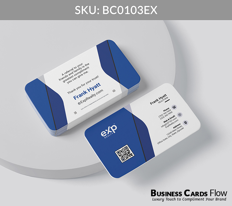 - Use of white and blue maintains consistency with eXp Realty’s brand, enhancing recognition and reinforcing trust in every card exchange.