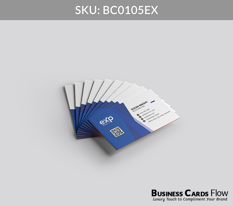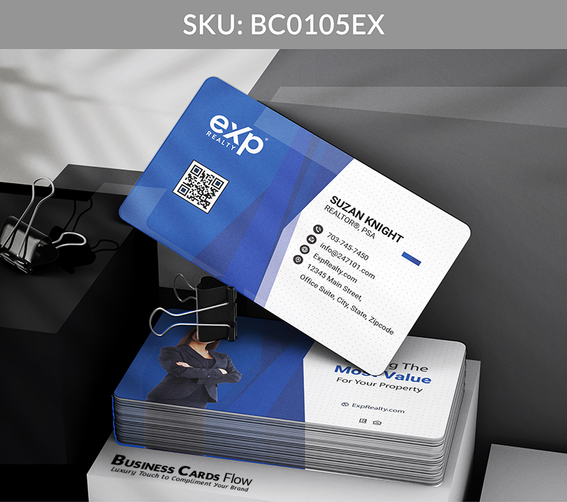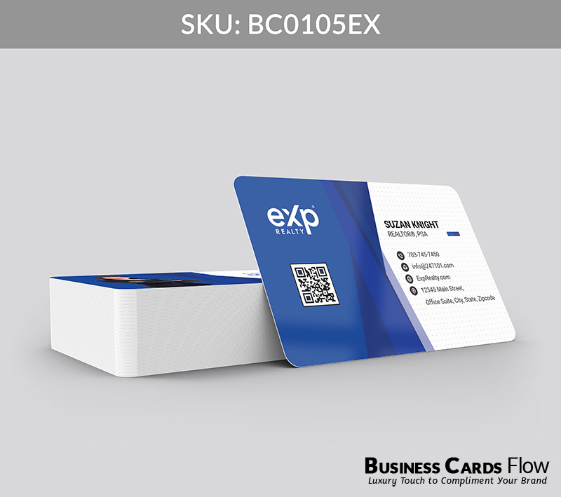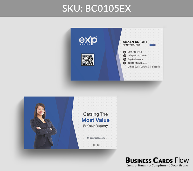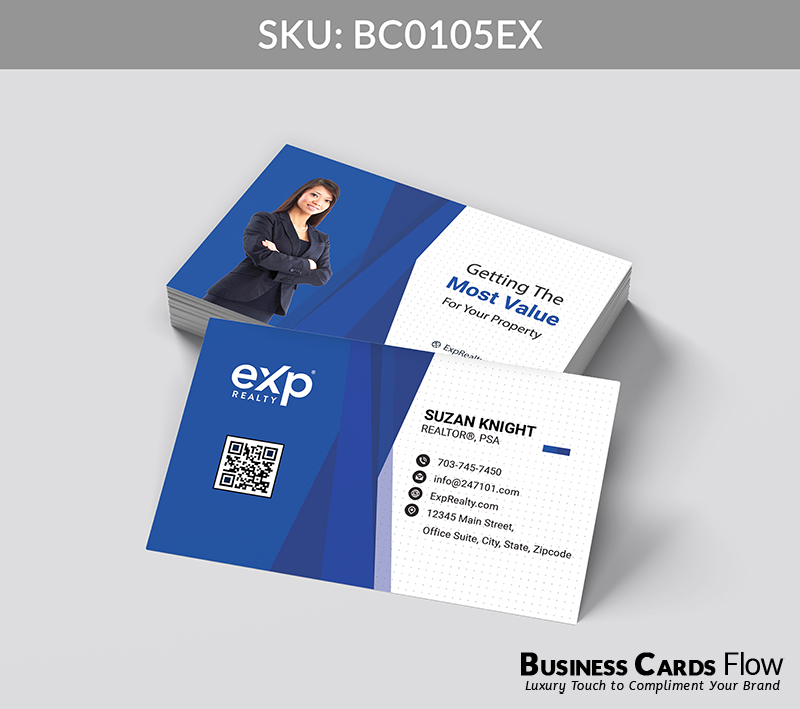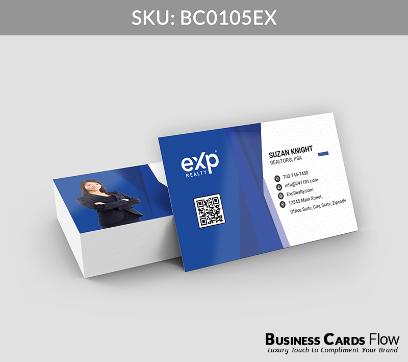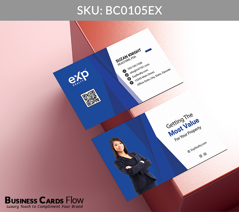 eXp Realty branded business cards featuring a functional QR code for instant client access—whether to call, text, or visit your website. The reverse side showcases your professional profile photo alongside a personal mission statement, reflecting your commitment to exceptional client service.