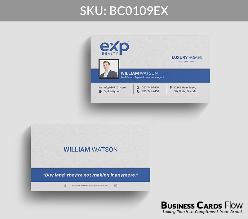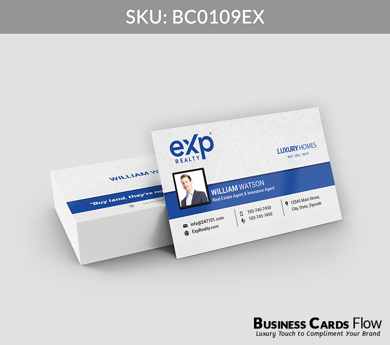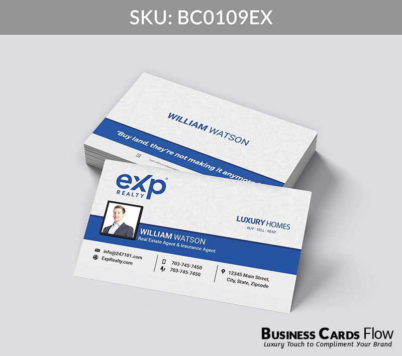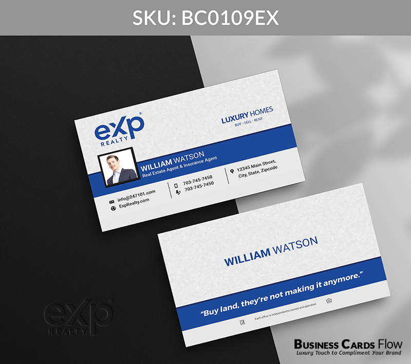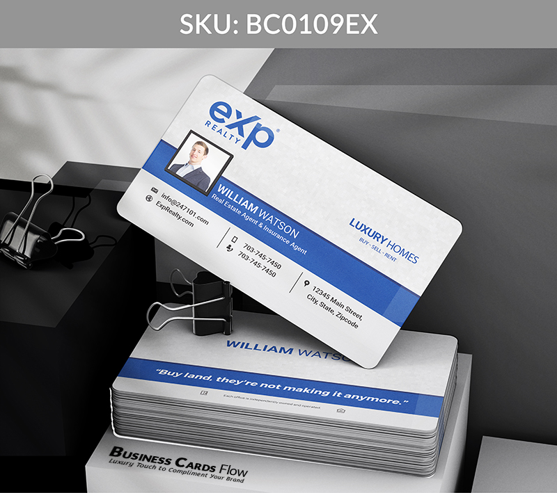 - Metallic foil accents in eXp blue or white: Elevate your name or slogan with a shimmering finish that adds depth, prestige, and visual impact.