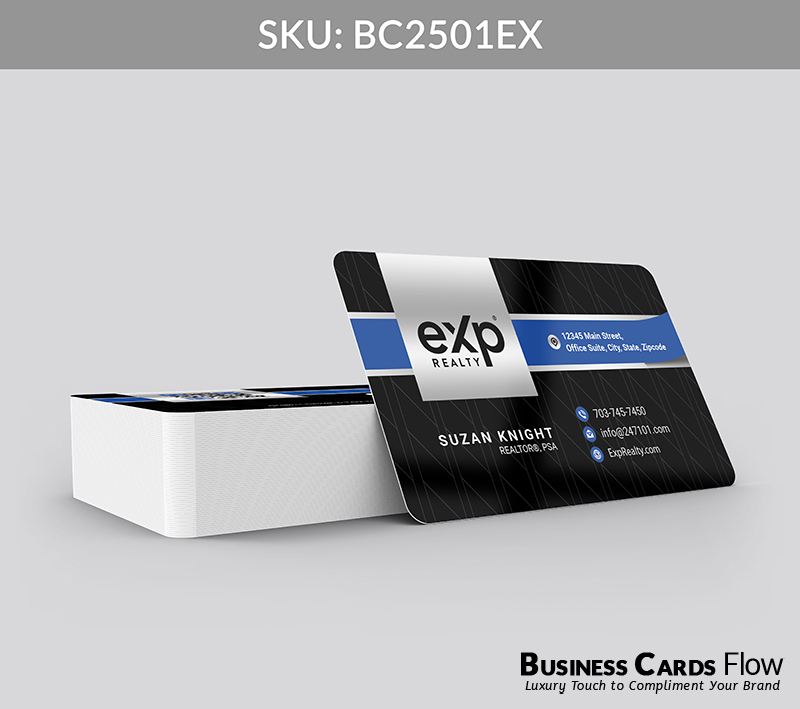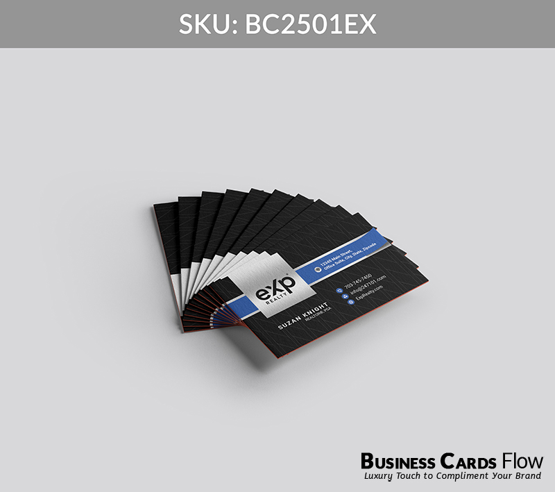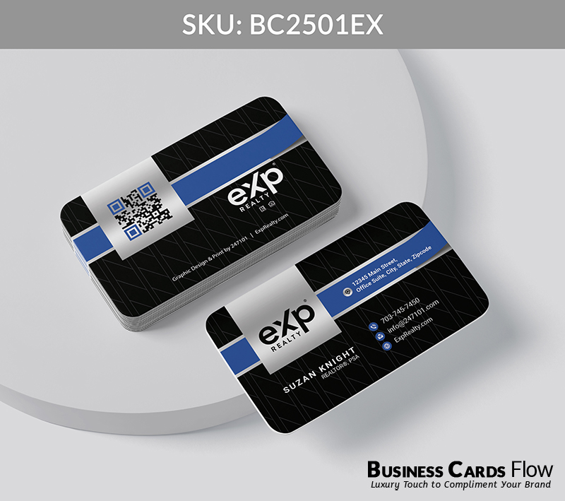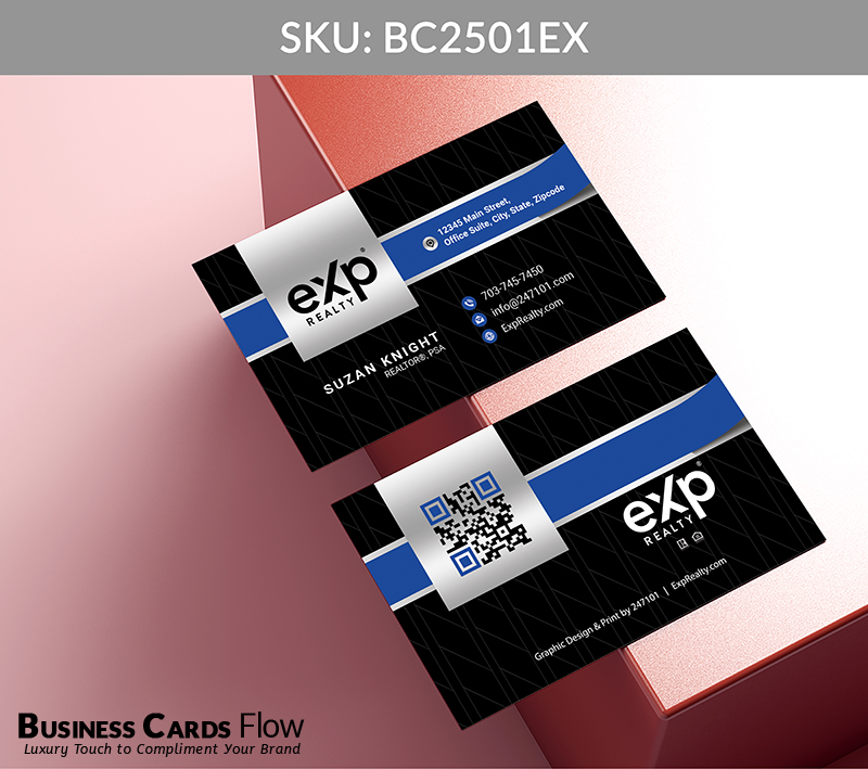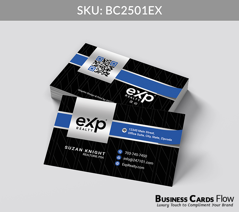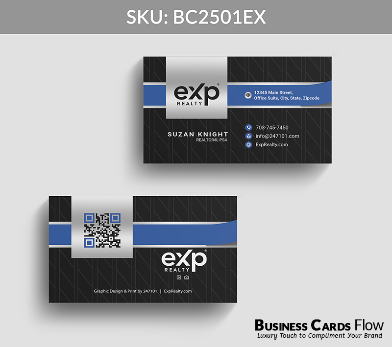 A stunning black background enhanced with a luxurious gold texture gives this business card an unmistakably unique and upscale feel. The front side elegantly presents your contact information alongside the eXp Realty logo, while the reverse includes a scannable QR code for effortless client engagement.