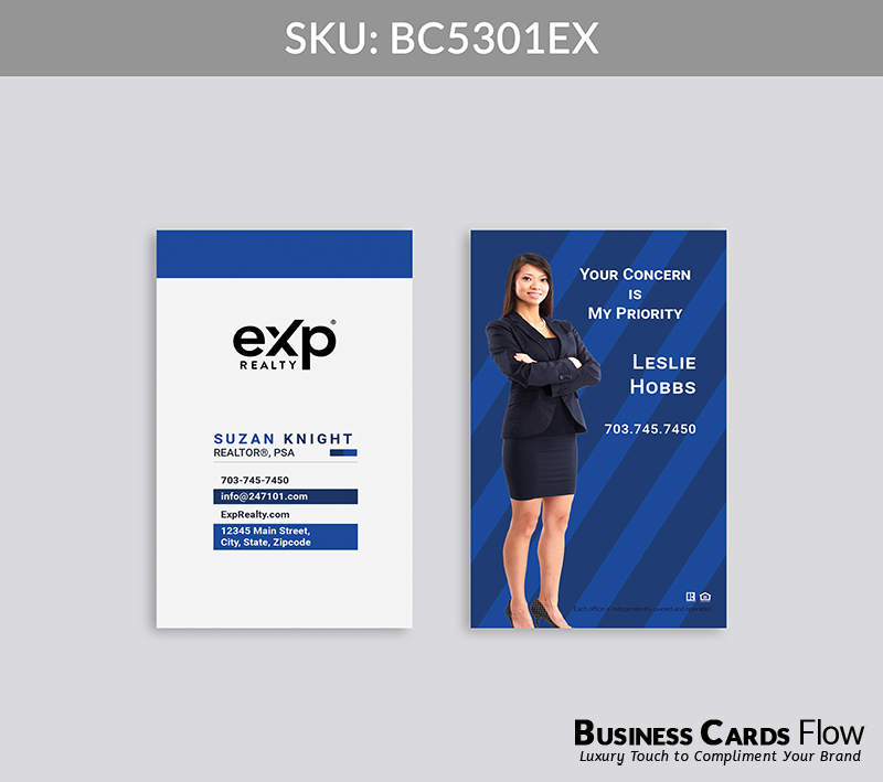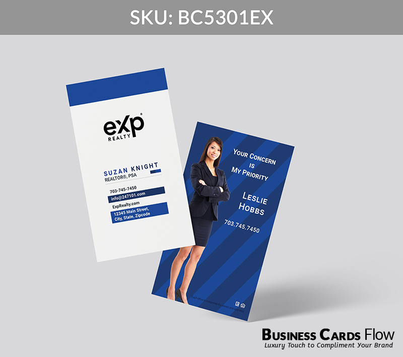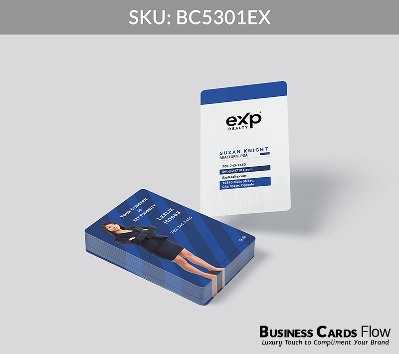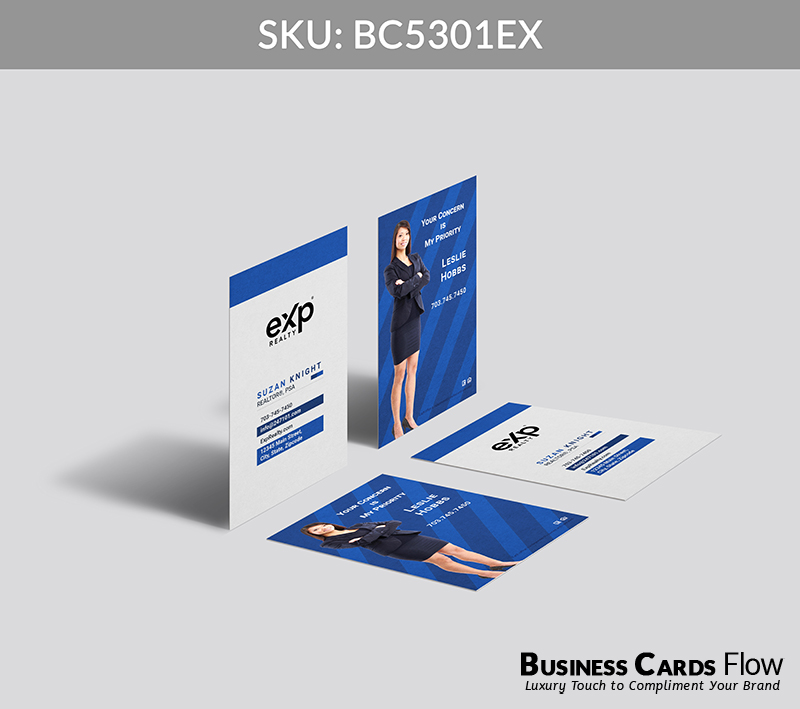 - Satin matte finish with raised blue foil accents draws attention to your name or slogan while maintaining a sophisticated feel aligned with eXp’s colors.
