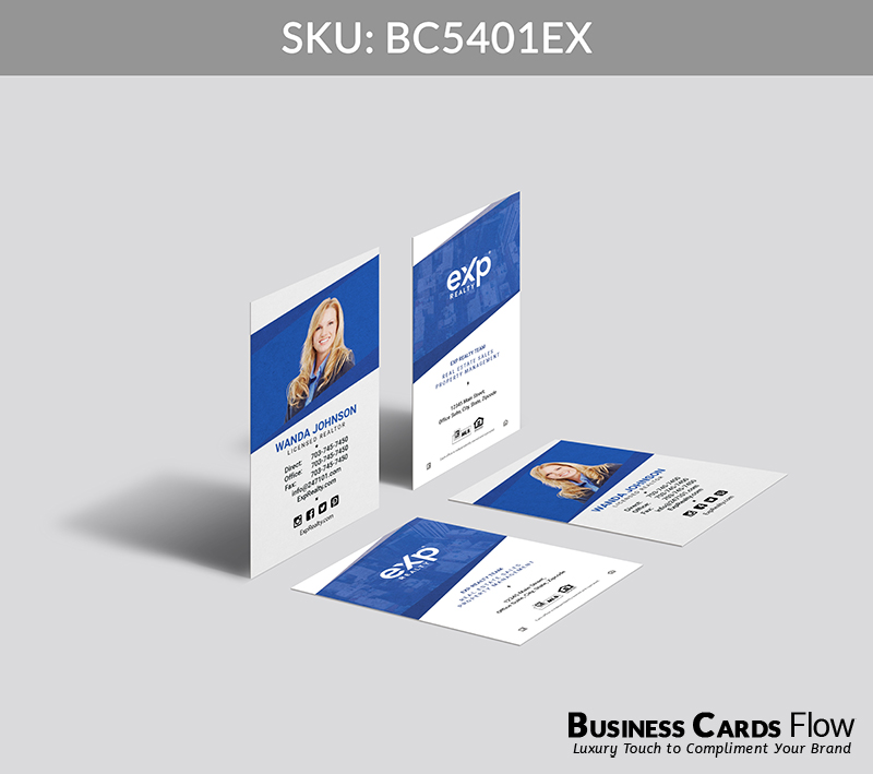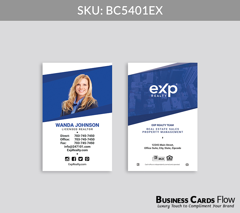 Use this card when meeting clients for the first time — your photo ensures instant recognition while your social icons make connecting seamless. At team events or local networking mixers, the vertical format and sharp blue-white palette help you stand out while staying fully aligned with the eXp brand. It’s not just a card — it’s a visual handshake that supports long-term client relationships.