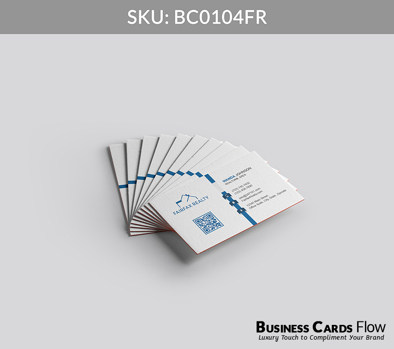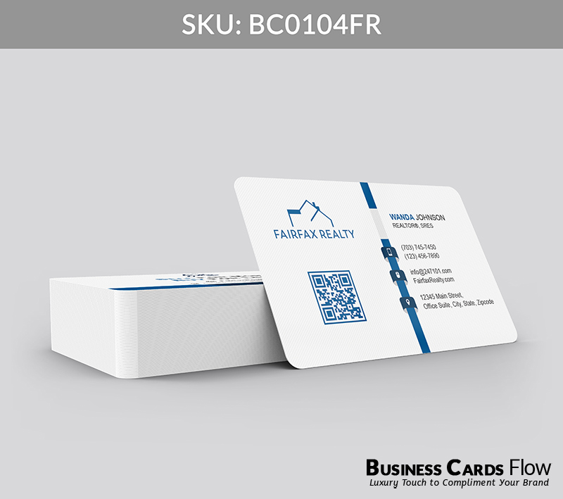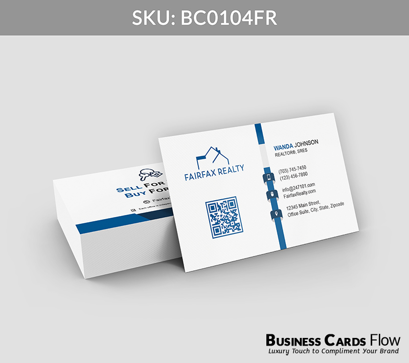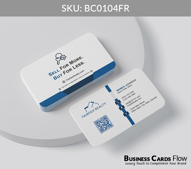 A: Not at all — the QR code is designed to integrate smoothly into the layout without disrupting the card’s elegance. With optional blue foil or minimalist icon framing, it becomes a sleek, branded feature that enhances both function and style. It’s a smart way to connect with clients while staying true to Fairfax Realty’s polished aesthetic.