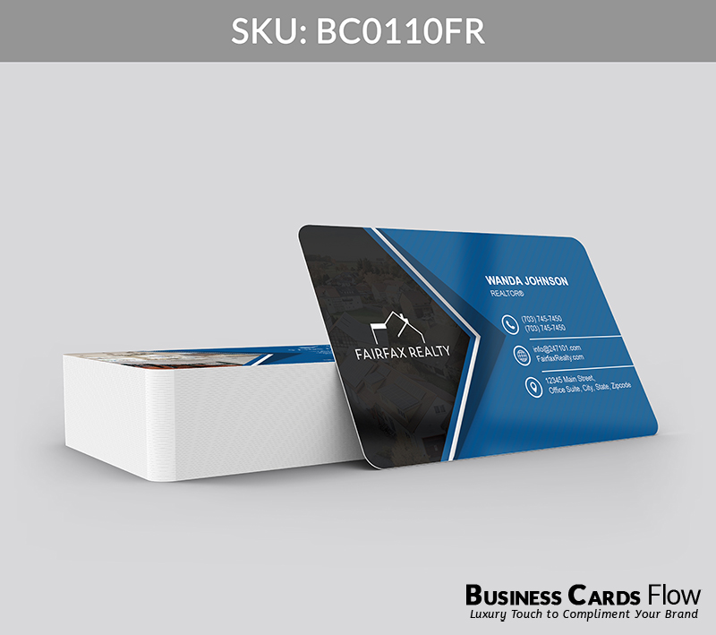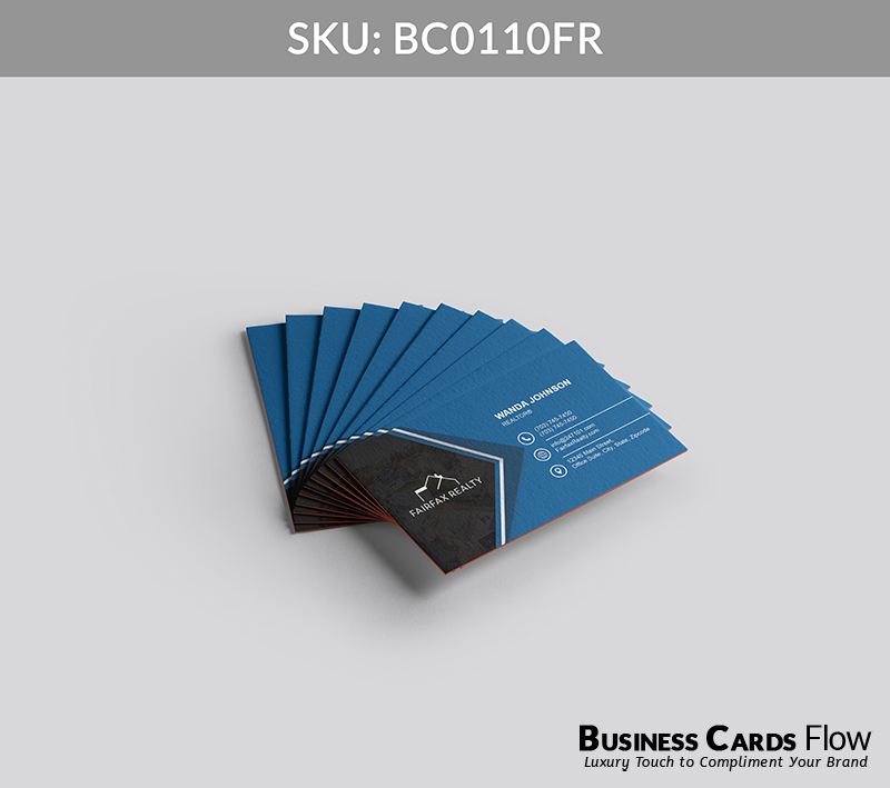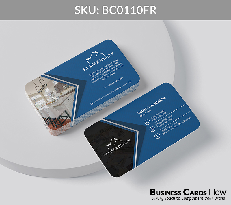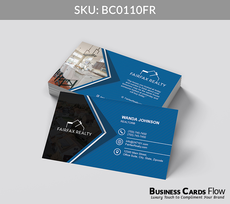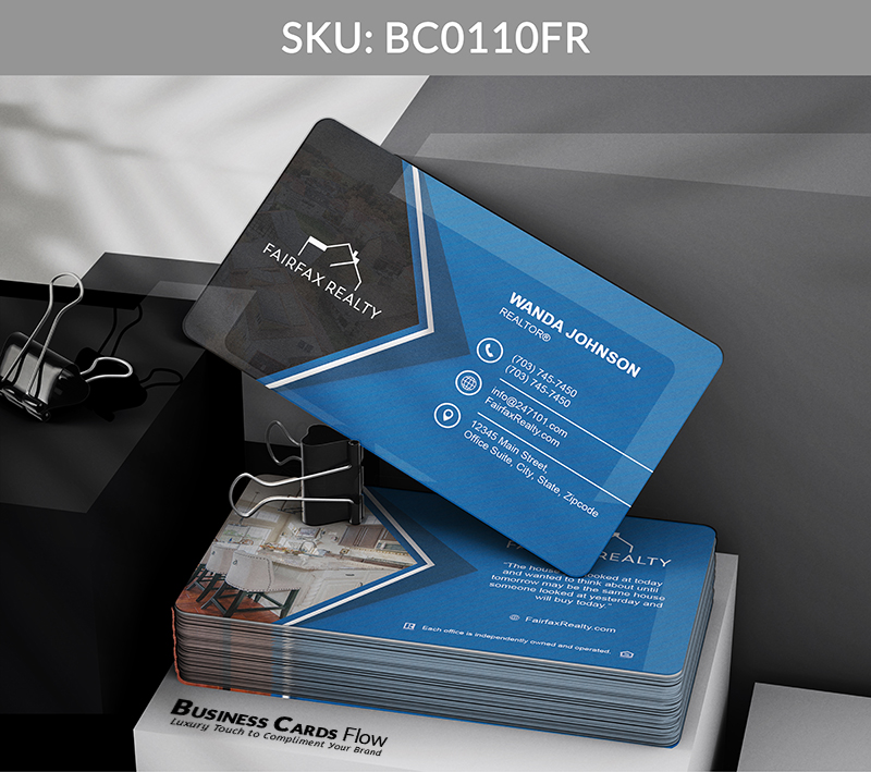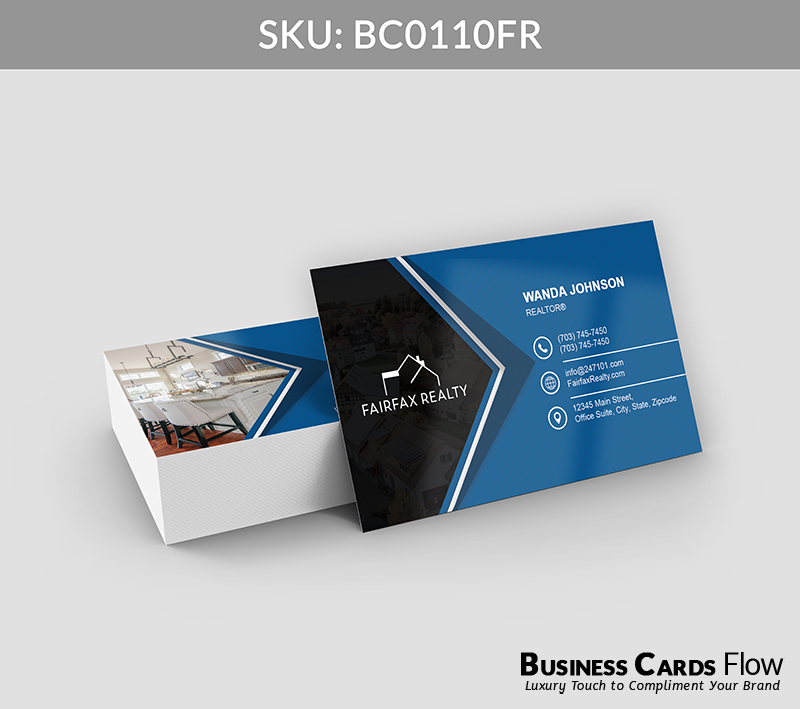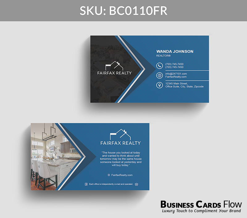 A modern black banner business card created exclusively for Fairfax Realty agents. It features your contact information on the right-hand side, with your personal commitment or brand slogan showcased on the reverse.
