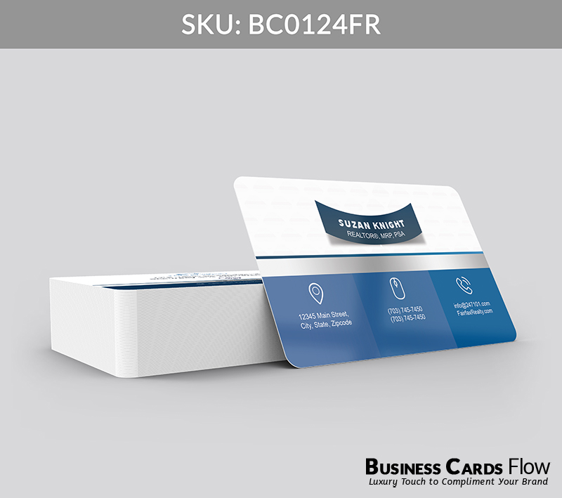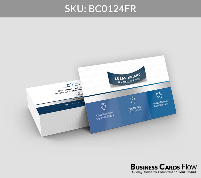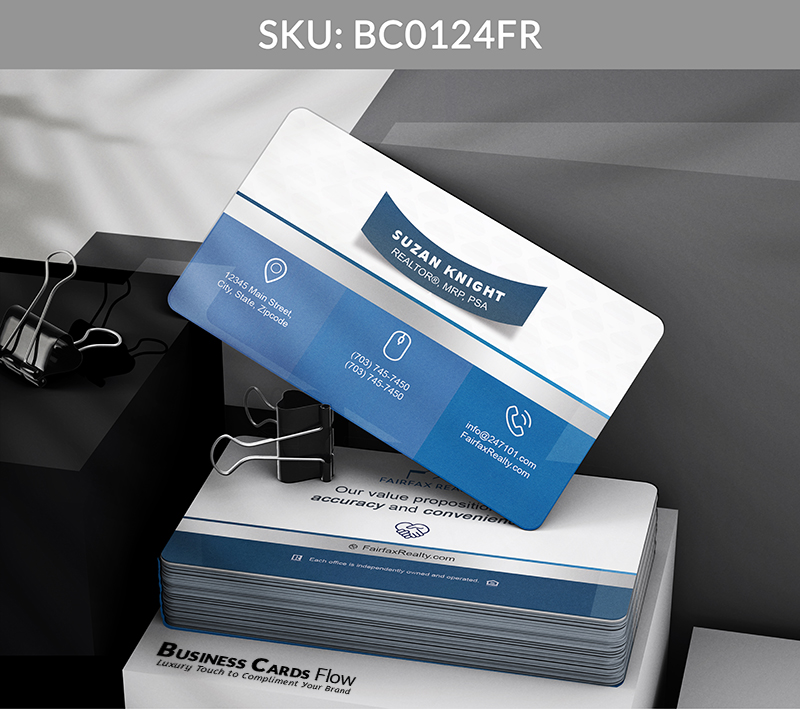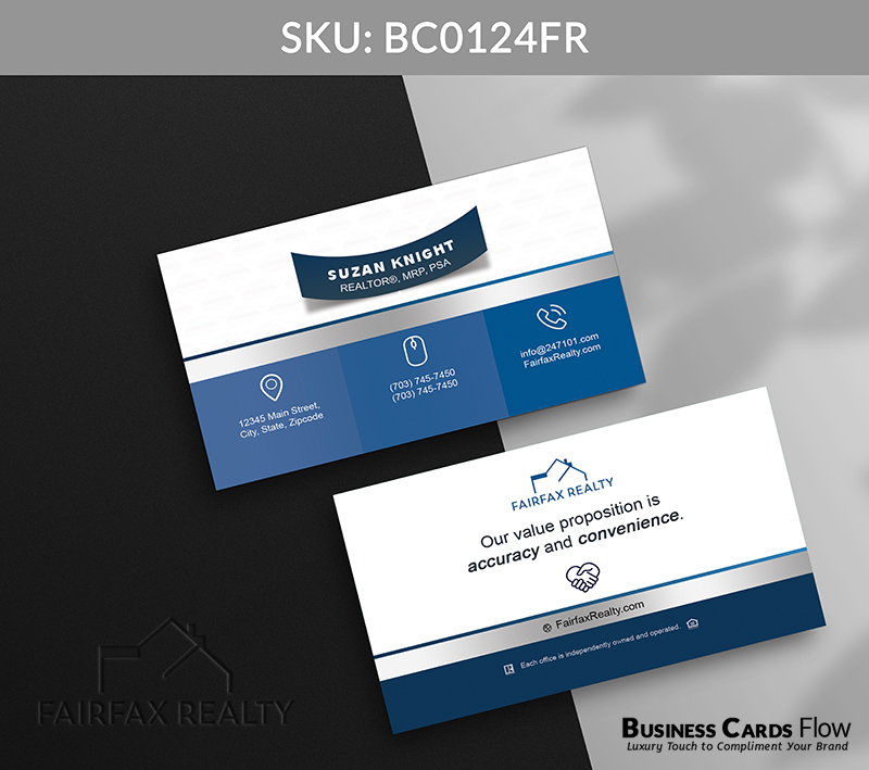 Designed for agents who understand that first impressions are lasting, this card commands attention with a confident 3D-style name ribbon — a statement of presence and pride. The option to include a custom quote on the back, paired with Fairfax Realty’s Blue and White color scheme, reinforces your voice and the brokerage’s trusted identity.