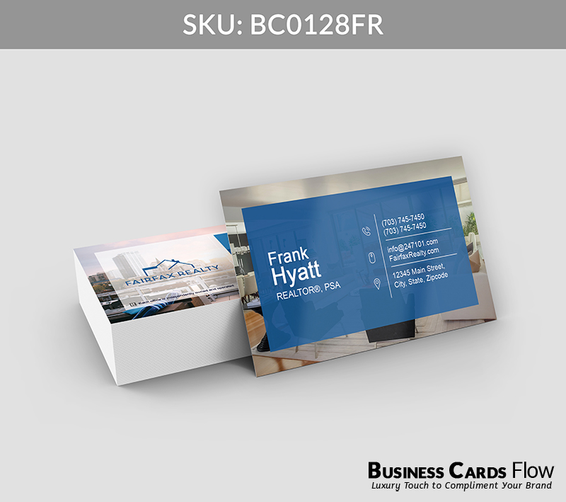 Designed for the modern real estate professional, this vibrant yet refined card layout captures attention while preserving an air of polished sophistication. The use of Fairfax Realty’s signature Blue and White tones throughout ensures your brand presence feels both elevated and unmistakably aligned with your brokerage’s trusted image.