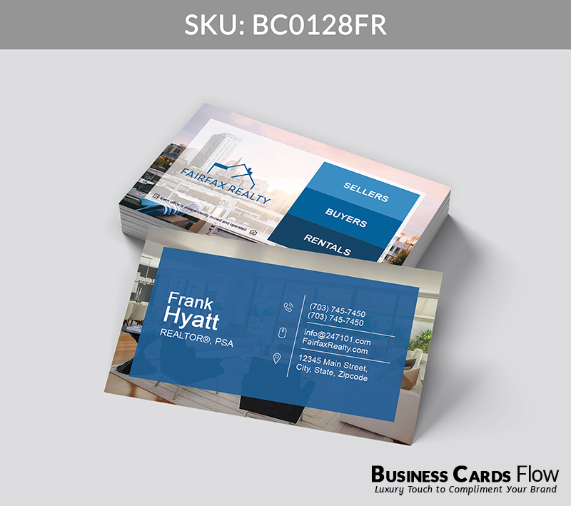 - Integration of Blue and White elements seamlessly ties the vibrant design to Fairfax Realty’s distinguished brand identity, reinforcing your professionalism at every touchpoint.