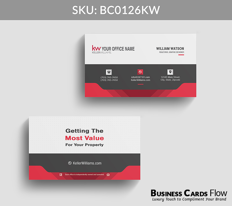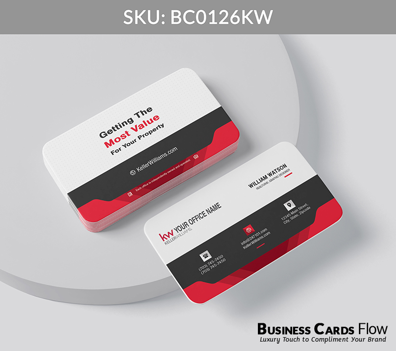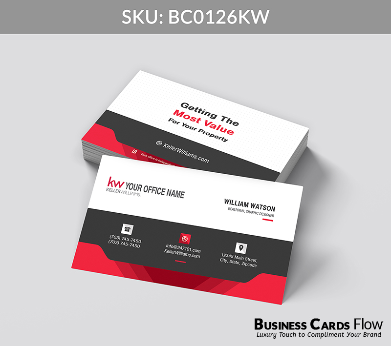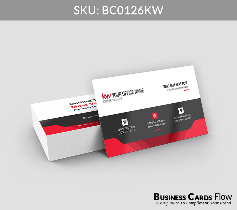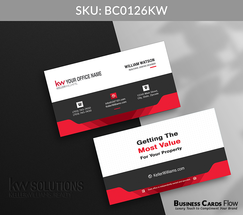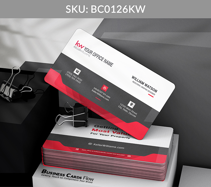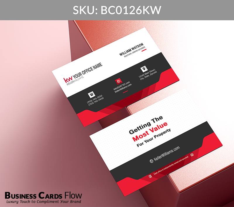 Striking black and white split business cards designed with branded content at the top and essential contact information at the bottom. The reverse side offers the flexibility to showcase either your personalized website URL or the standard KellerWilliams.net link.