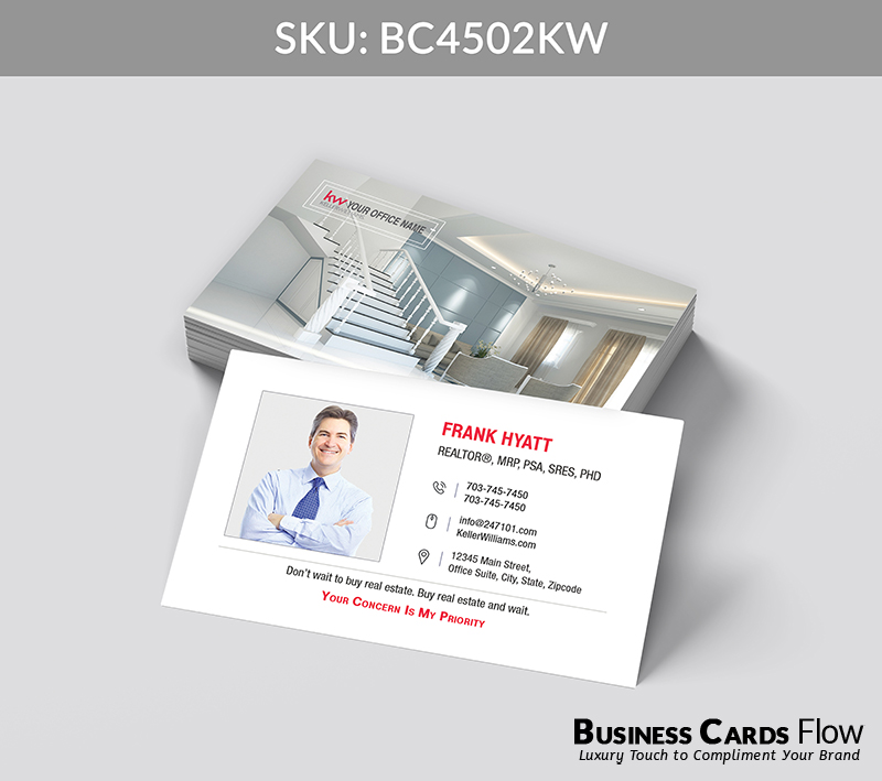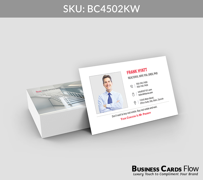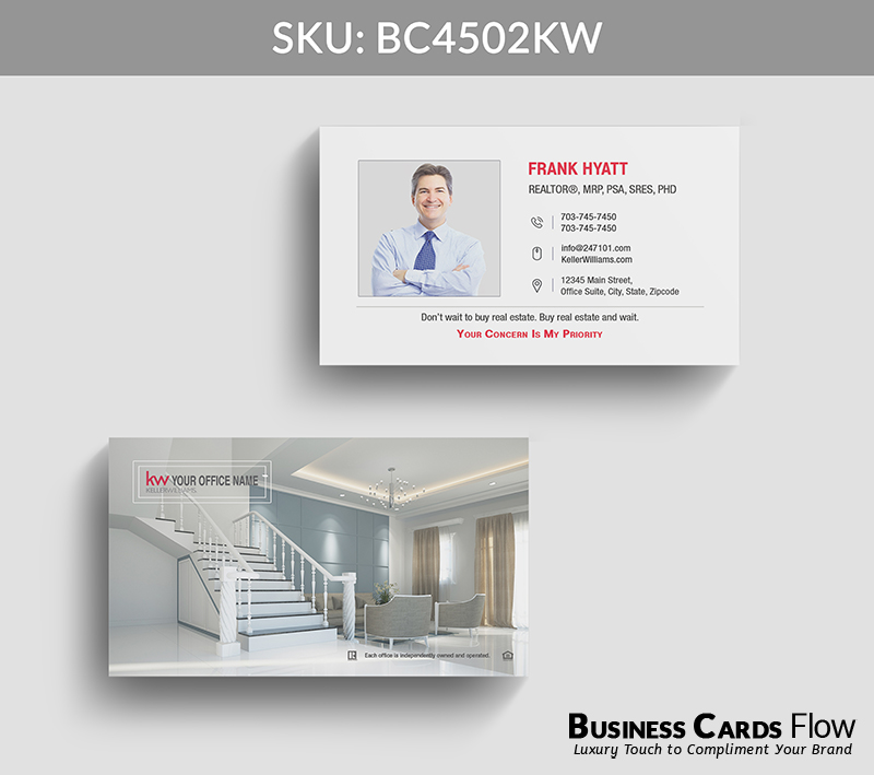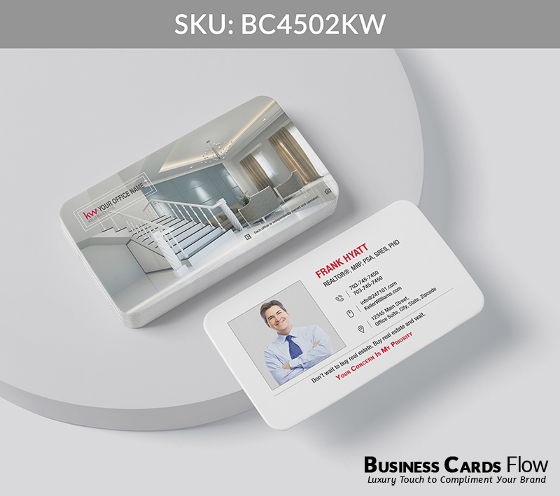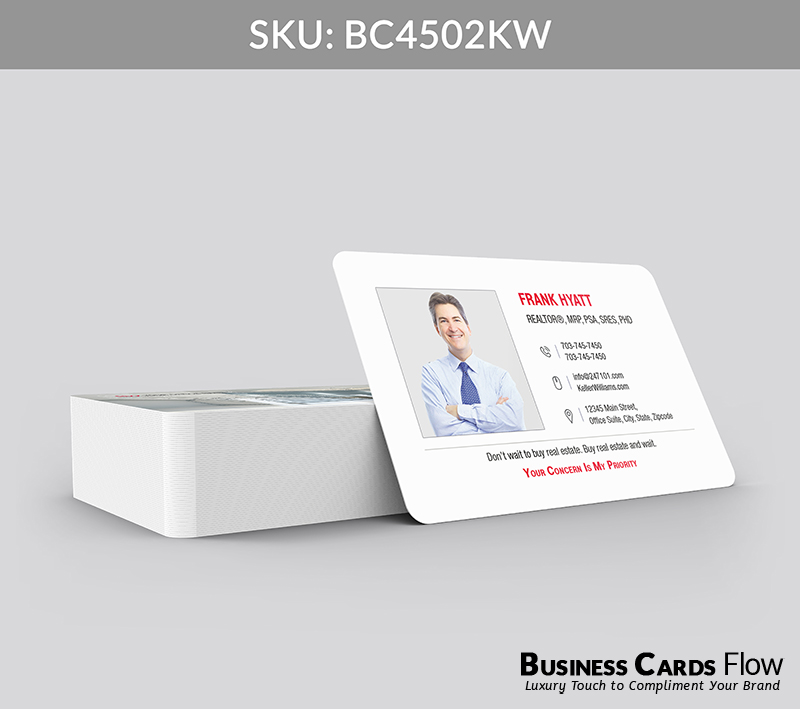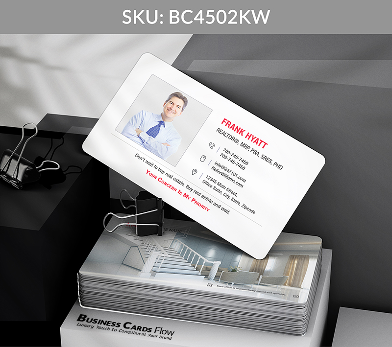 - Metallic foil accents in Keller Williams’ signature red highlight key elements like your name or slogan, adding an eye-catching touch of sophistication and elevating your card’s visual appeal.