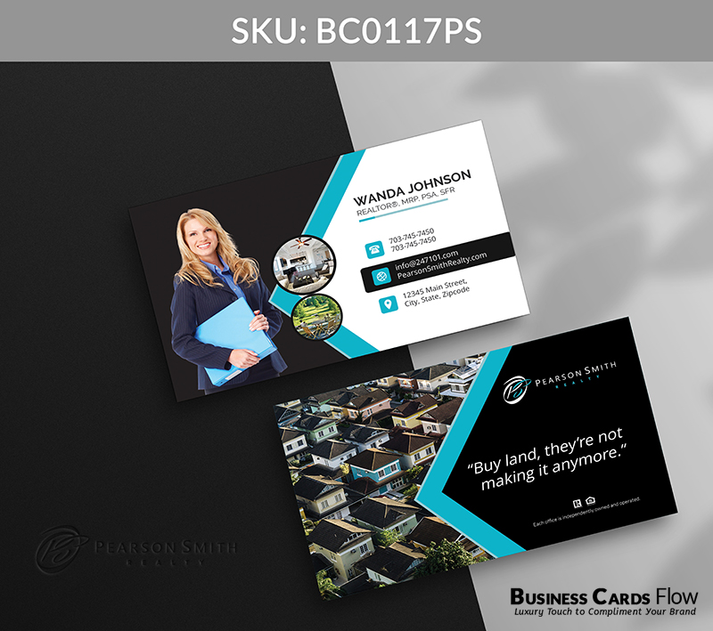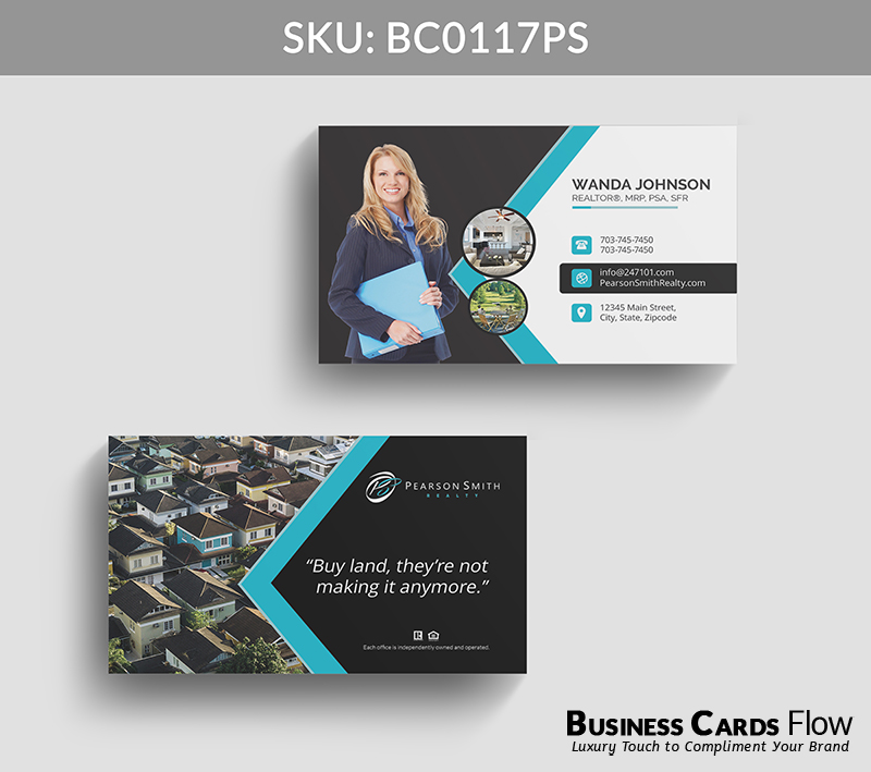 This design turns your personal image into a branding asset — placing your professional presence front and center while maintaining balance and sophistication. When paired with Pearson Smith’s signature Blue and Grey, the result is a visually cohesive brand tool that signals trust, recognition, and elevated service.