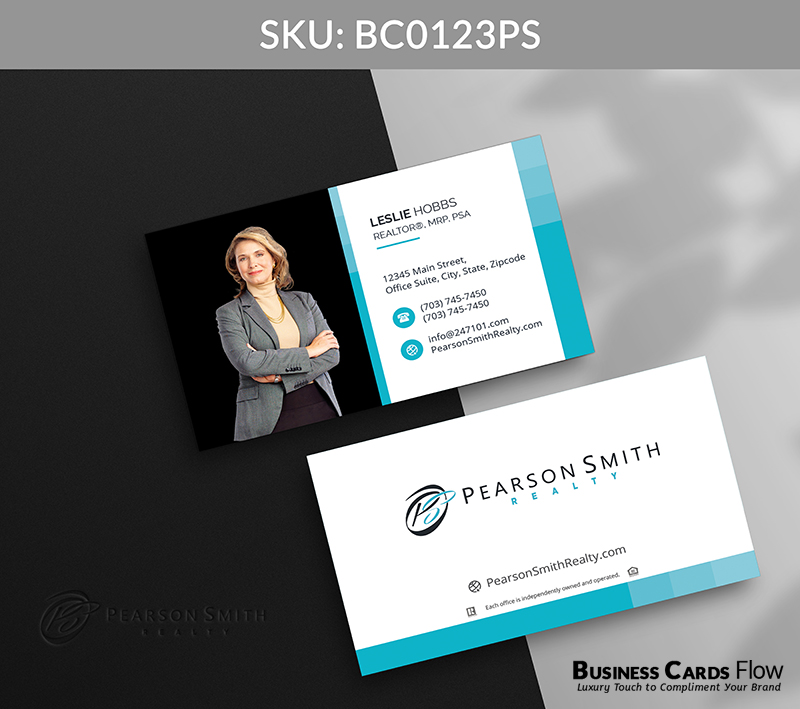This elegant card layout features the Pearson Smith agent’s profile photo prominently on the left side, while essential contact information is displayed with precision on a clean white background to the right. The back of the card is anchored by the Pearson Smith logo and includes a direct link to the brokerage’s website.