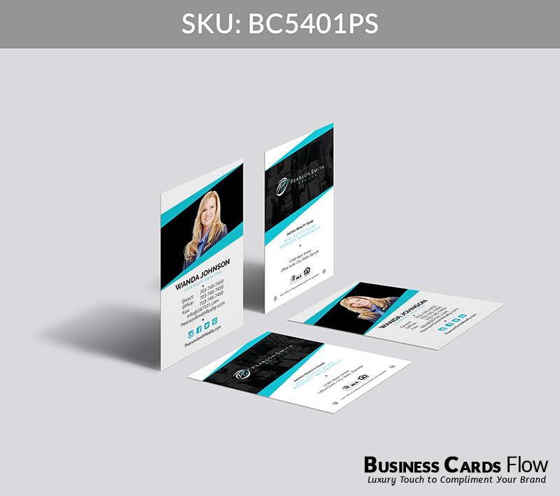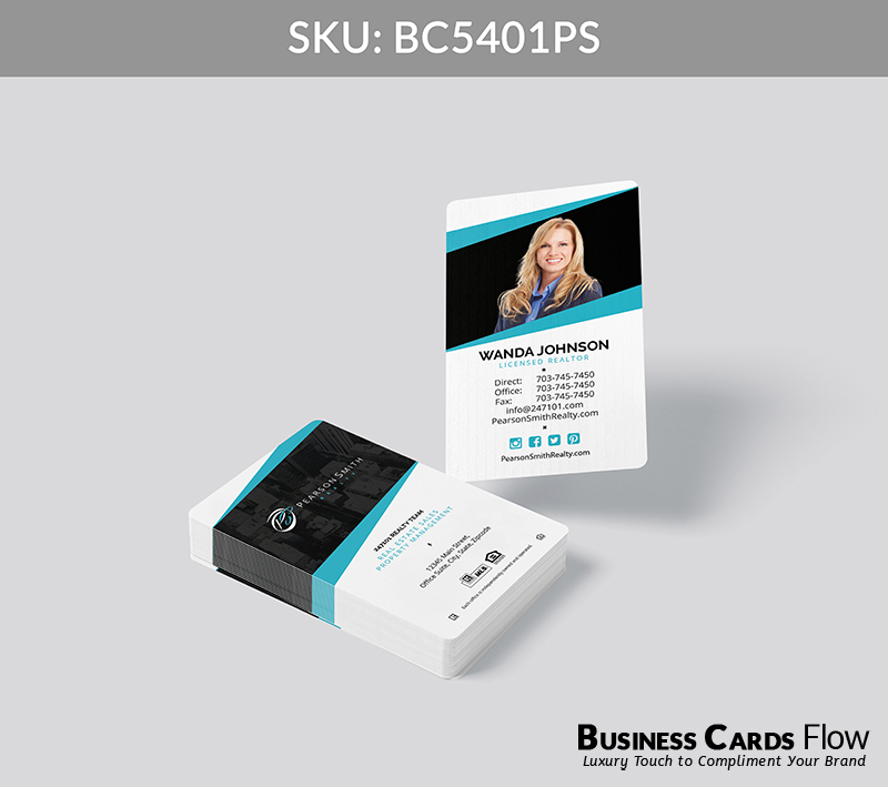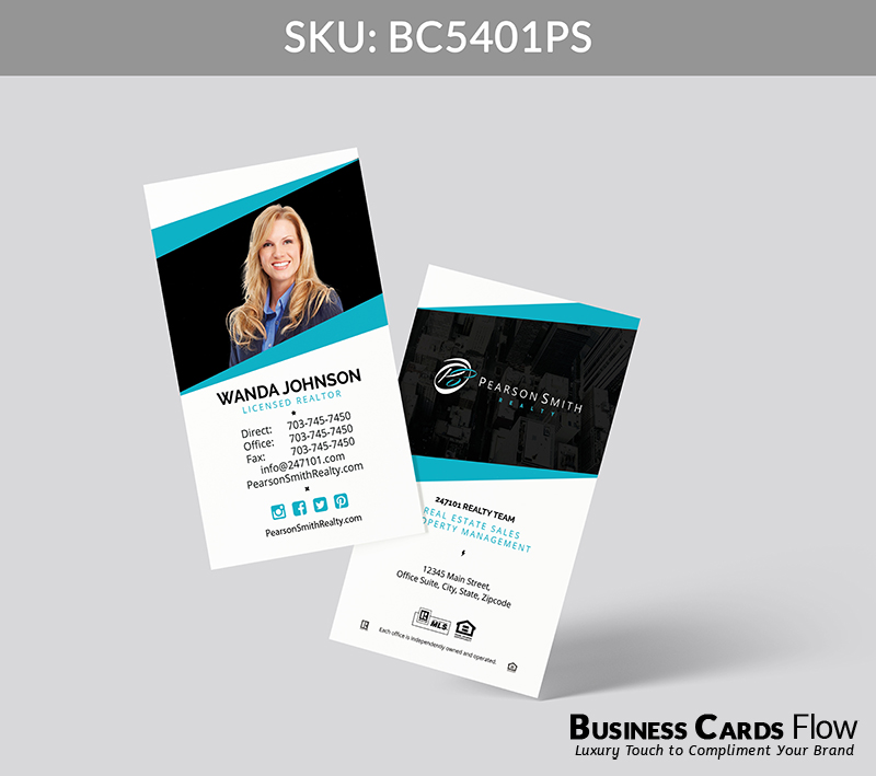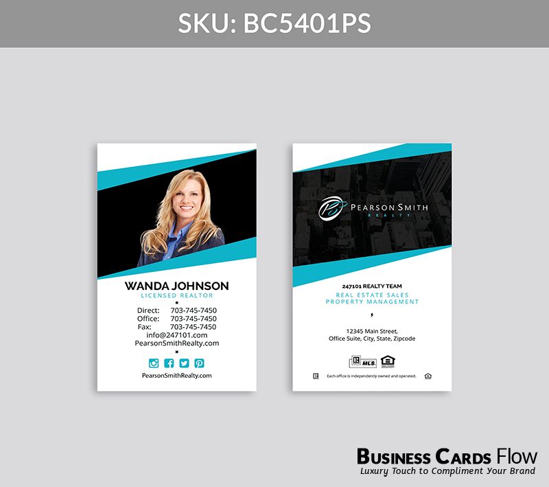 This elegant vertical layout is designed to spotlight your professional identity—combining your photo and contact details in a visually commanding format that feels personal and polished. On the reverse, brokerage information is framed with clean structure and subtle Blue and Grey elements, reinforcing Pearson Smith’s trusted reputation with every exchange.