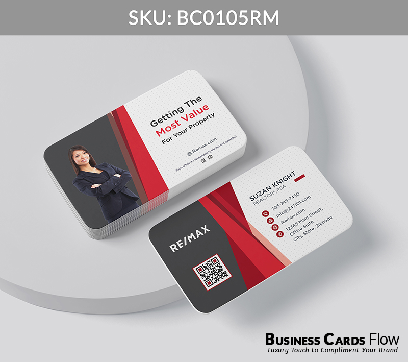 These REMAX-branded business cards feature integrated QR code capability, allowing your clients to scan and instantly call, text, or visit your website. The reverse side showcases your professional profile picture alongside a personalized message expressing your mission and unwavering commitment to your clients.