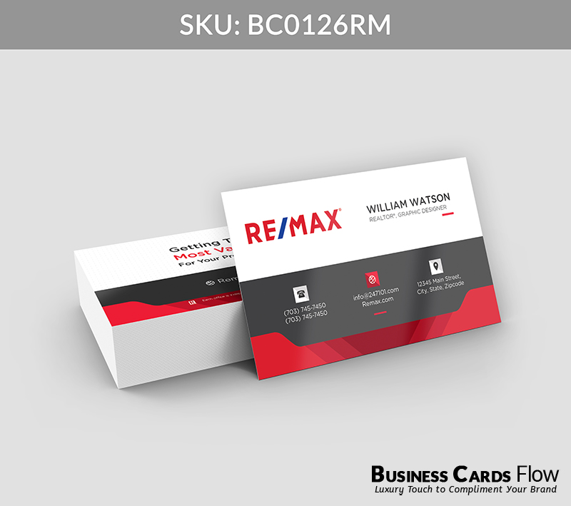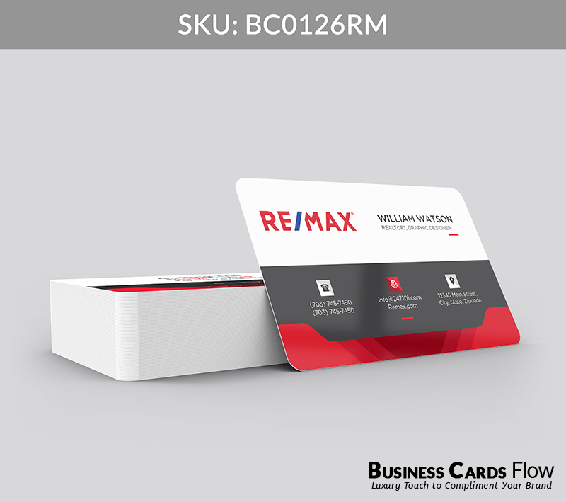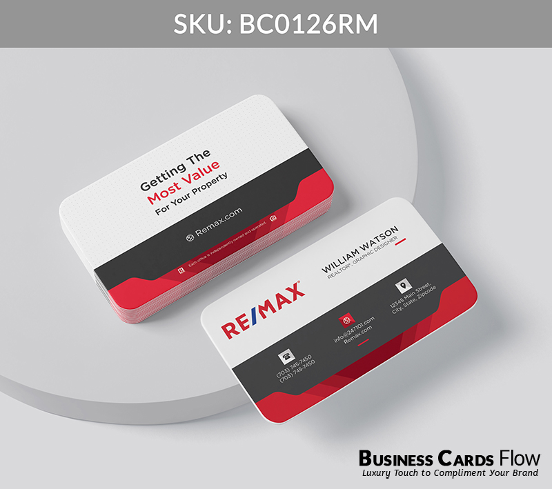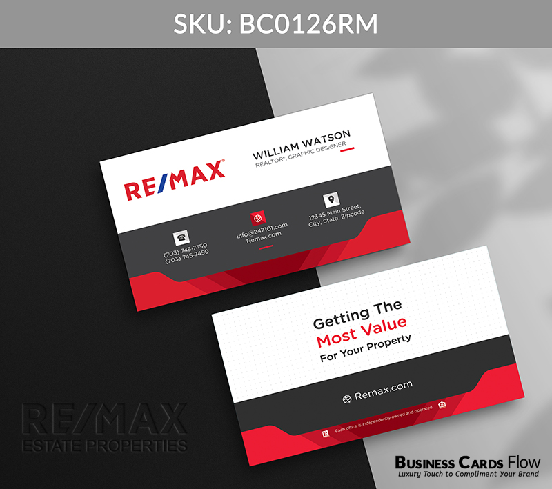 Designed for agents who value visual precision and modern sophistication, this card’s split-tone layout exudes balance, clarity, and confidence. With REMAX’s signature red, blue, and gray accents easily incorporated into the branding area, your card becomes a seamless extension of your professional identity.