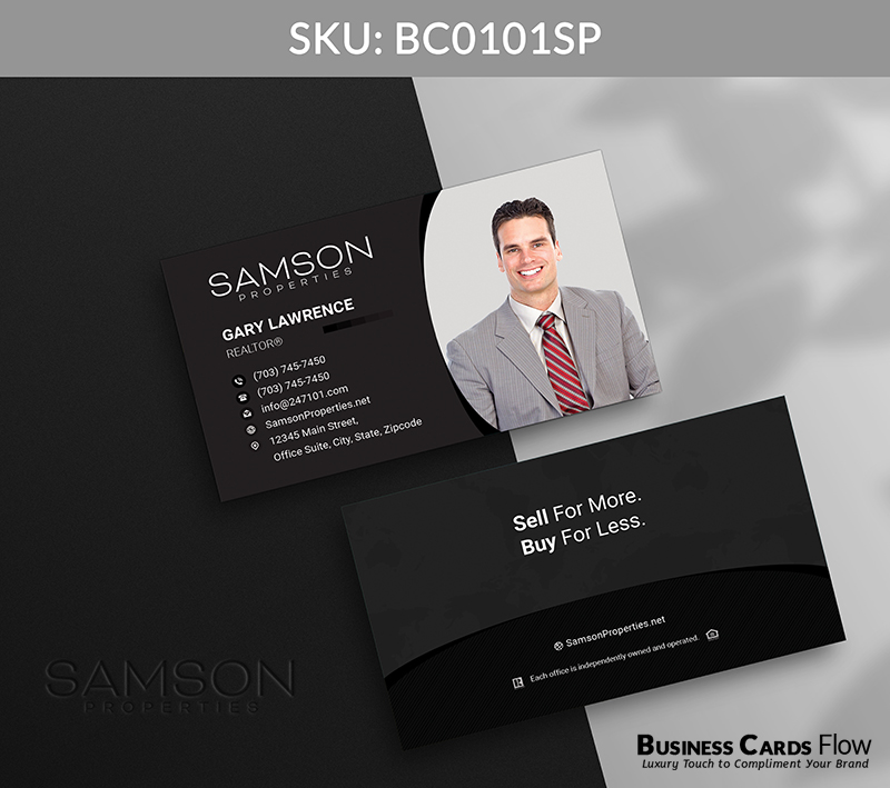 Designed for the discerning real estate professional, this card balances personal presence with strategic branding. The clean white and black palette of Samson Properties adds a timeless elegance, reinforcing both prestige and trust at first glance.