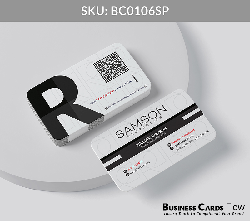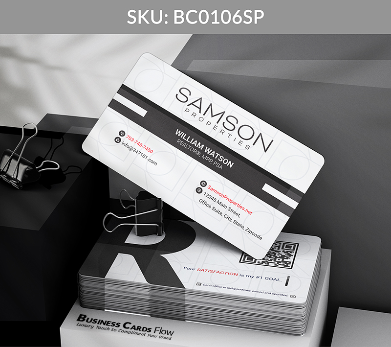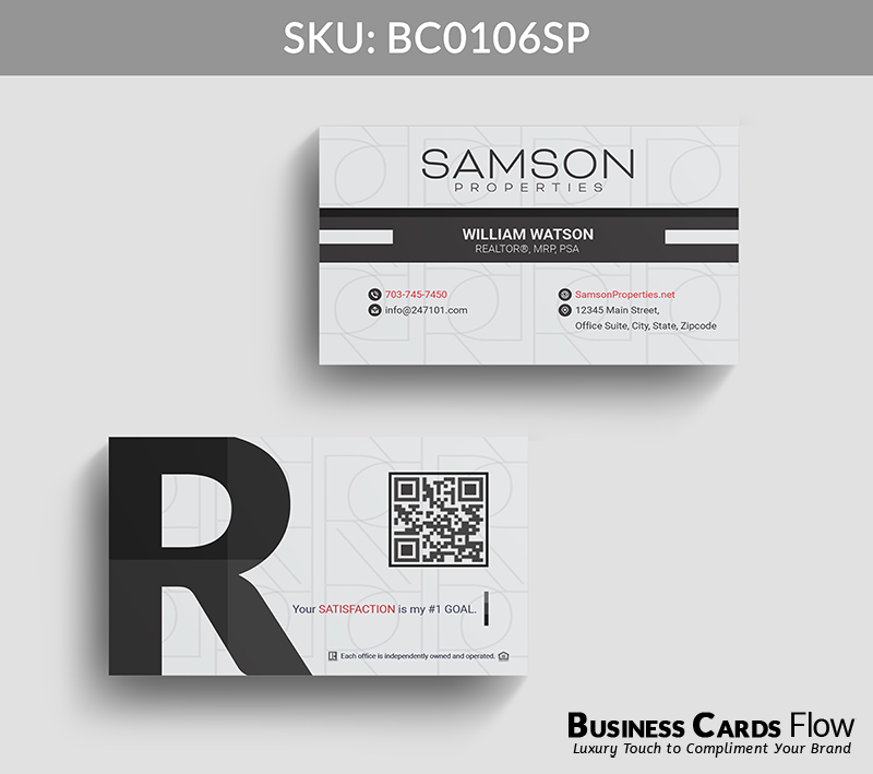 Hand your card to new clients during first impressions — the modern black banner immediately conveys trust and distinction. At open houses, its consistent black and white design reinforces your brand professionalism as a Samson Properties agent. And when networking with industry peers, the REALTOR® logo and bold layout set you apart as a polished, high-performing professional.