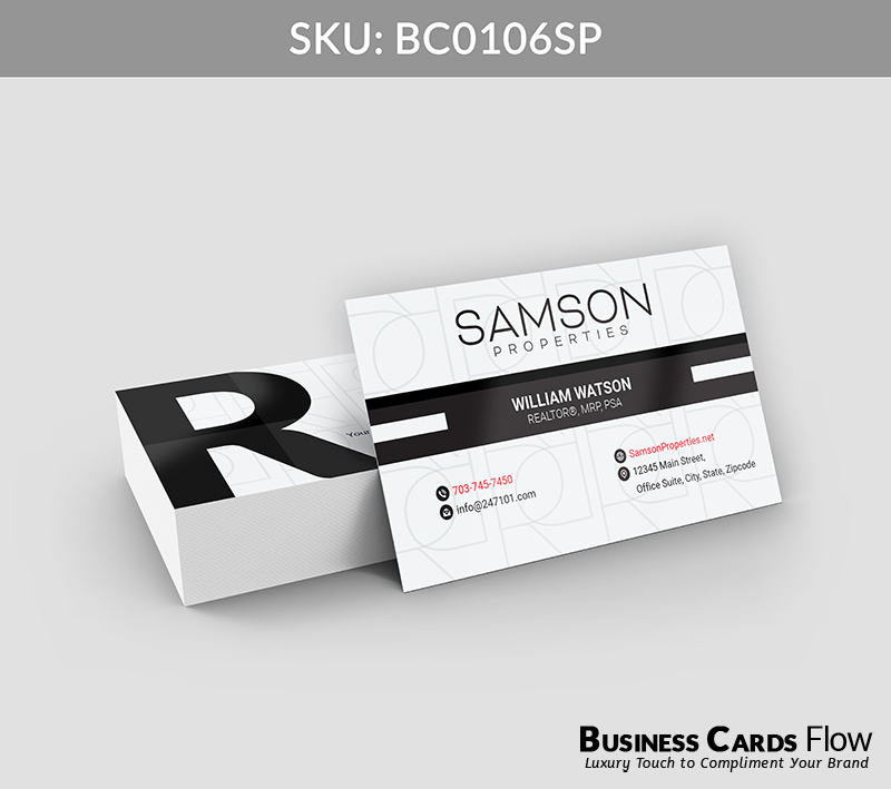 Modern black banner business card designed specifically for Samson Properties agents. Your phone number and website are prominently highlighted for effortless client access, while the reverse side features a beautifully styled REALTOR® logo in a sleek, contemporary design.