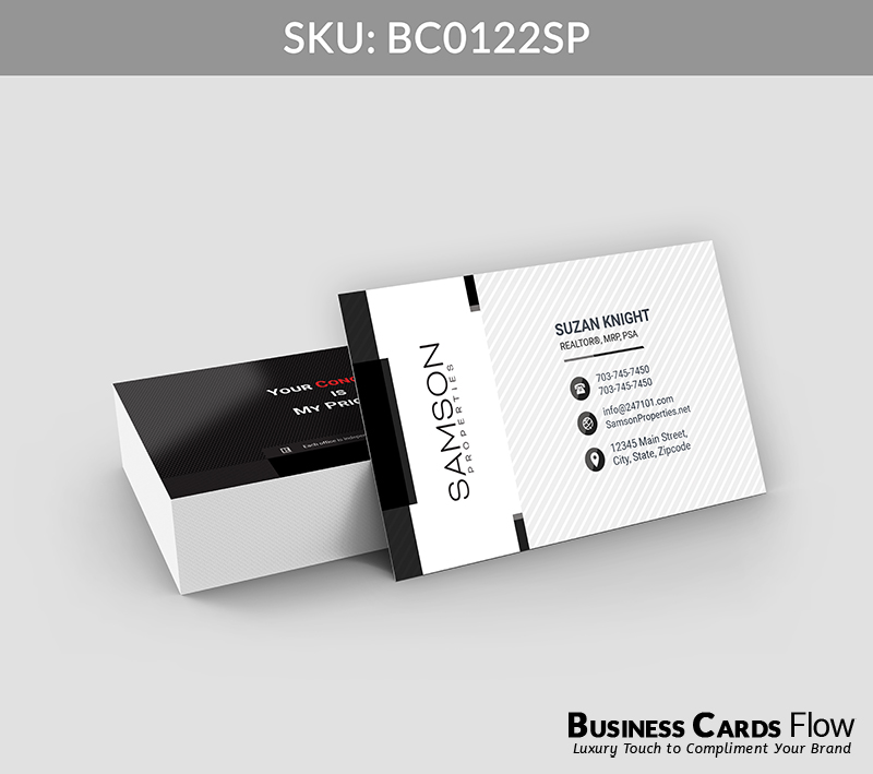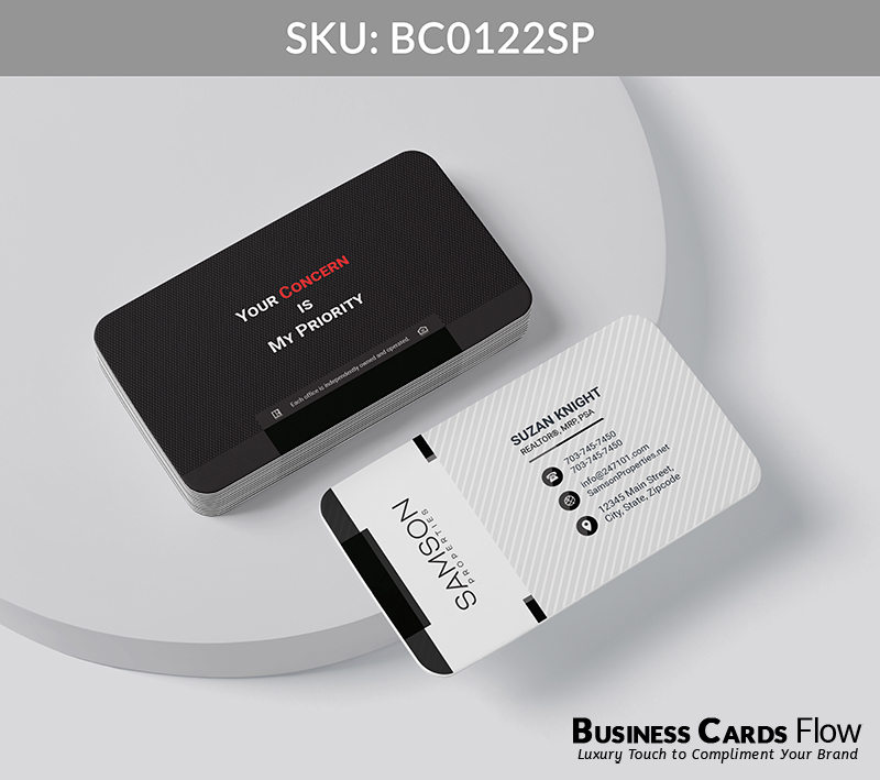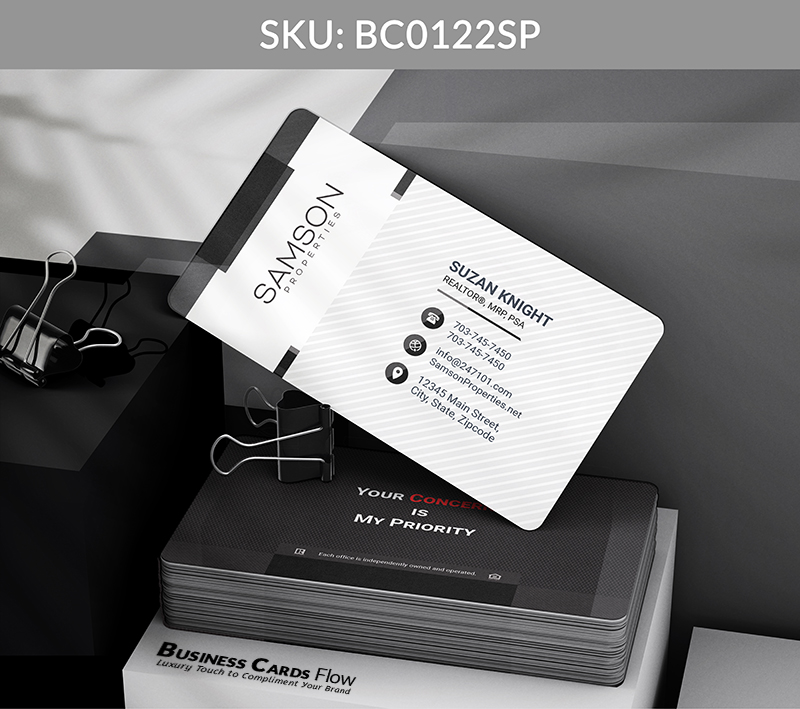 This business card strikes a commanding balance between bold identity and premium professionalism — crafted for agents who lead with purpose and polish. The dynamic interplay of white and black anchors your card in Samson Properties’ trusted brand palette, while the vibrant mission statement on the back leaves a lasting emotional imprint.
