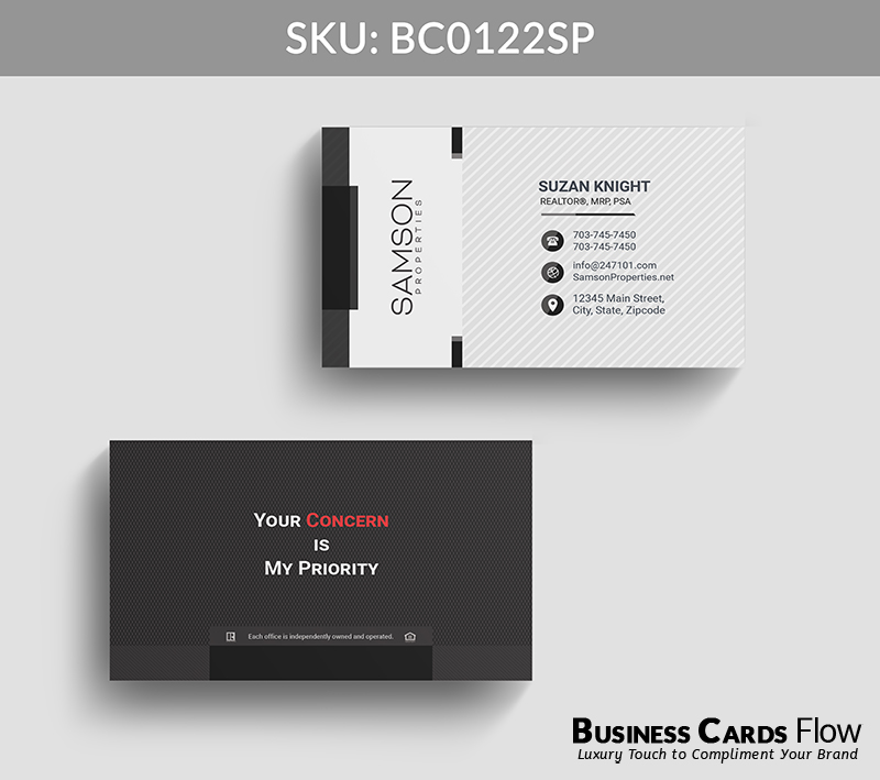 Deliver this card at networking events to instantly convey your professionalism and clarity of purpose. The bold black reverse and high-contrast typography ensure your mission resonates long after the meeting ends. Every detail — from the Samson logo to the color story — reinforces brand trust and visual alignment in client consultations and listing presentations.