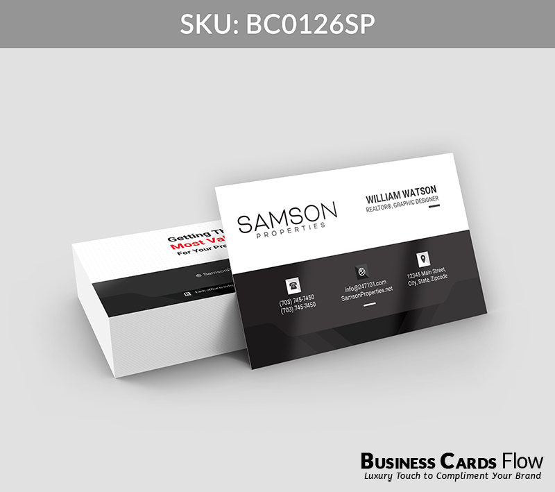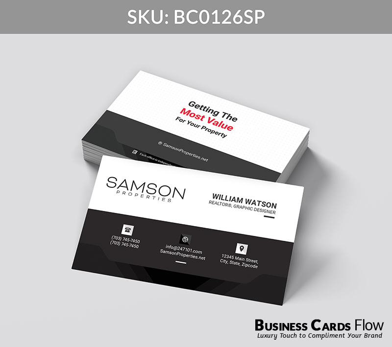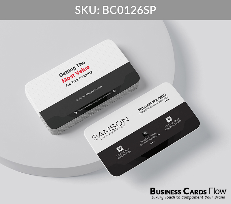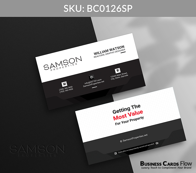 A visually striking black and white split business card, featuring branding-focused content prominently at the top and clean, well-organized contact information at the bottom. The reverse side offers flexibility — either a custom website link or the standard SamsonProperties.net to reinforce brand consistency.