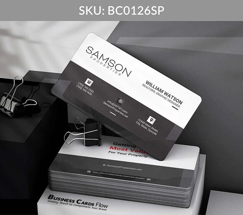 This modern card design speaks volumes before a word is spoken — commanding attention with its refined layout and brand-forward presentation. The black and white aesthetic echoes the professional excellence of Samson Properties, delivering a powerful first impression that aligns seamlessly with your elevated identity.