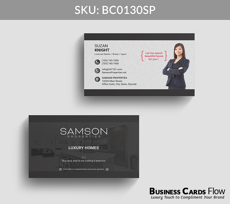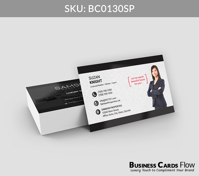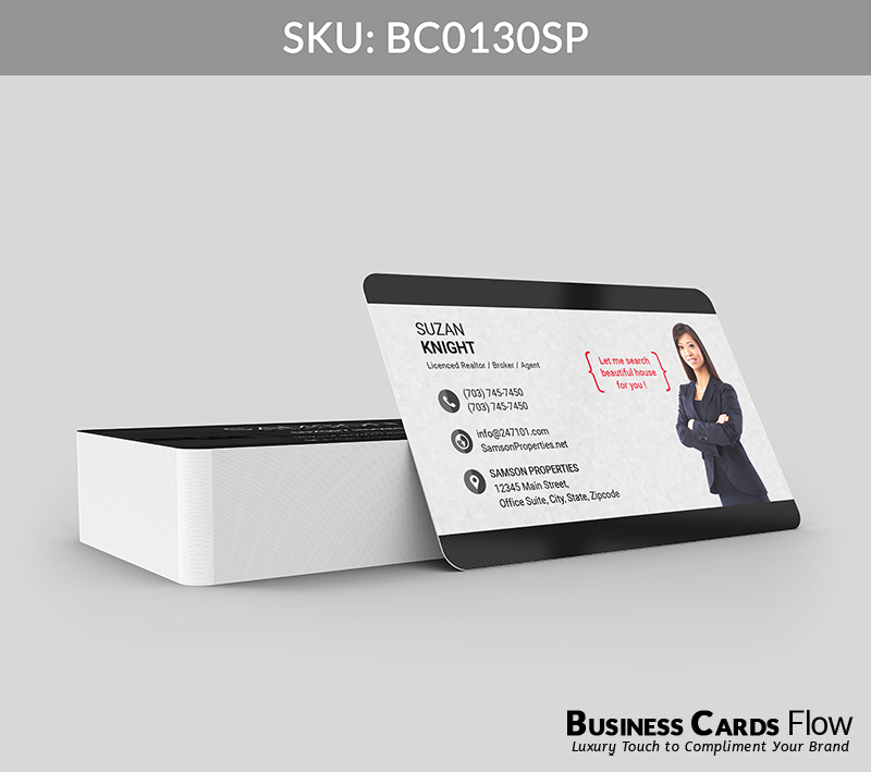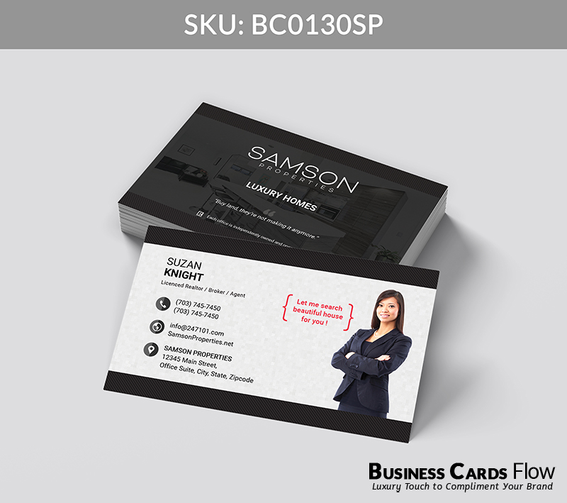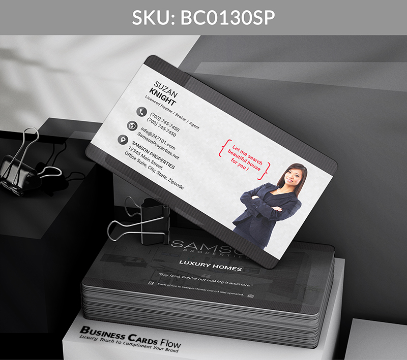 This business card mimics the striking layout of a high-end TV ad, featuring all contact details on the left side and the agent’s profile photo on the right. The back side showcases a sleek black overlay, offering a refined and modern finish.