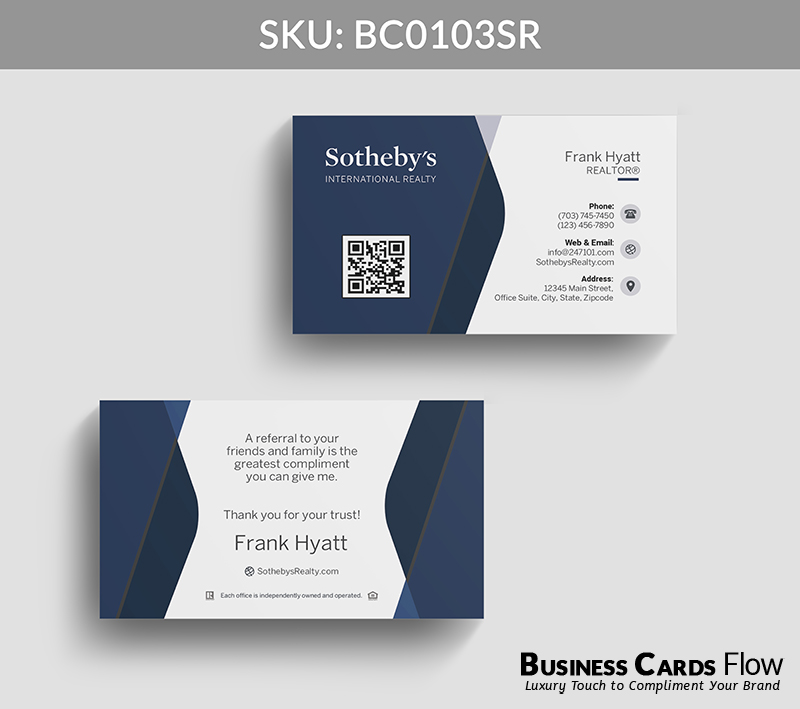 - When paired with Blue and Dark Blue accents, the white space and QR code create a crisp, sophisticated look that aligns beautifully with the Sotheby’s International Realty brand.