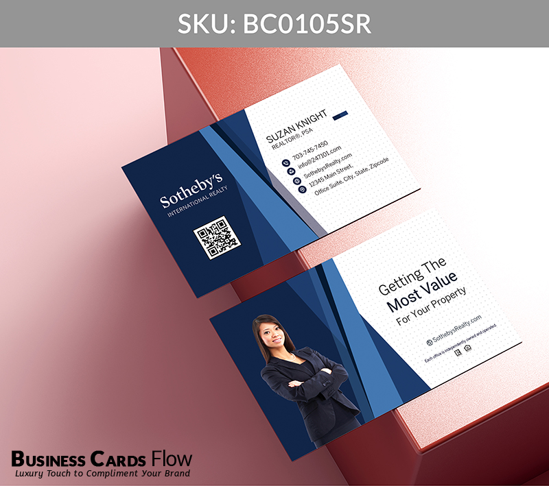 Sotheby’s International Realty branded business cards featuring built-in QR code functionality. The reverse side includes your professional profile photo alongside a mission statement or personal commitment to your clients, while the QR code enables instant access to call, text, or visit your website.