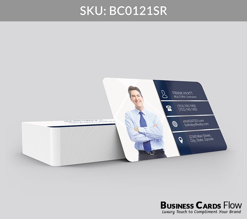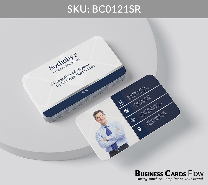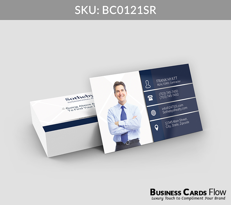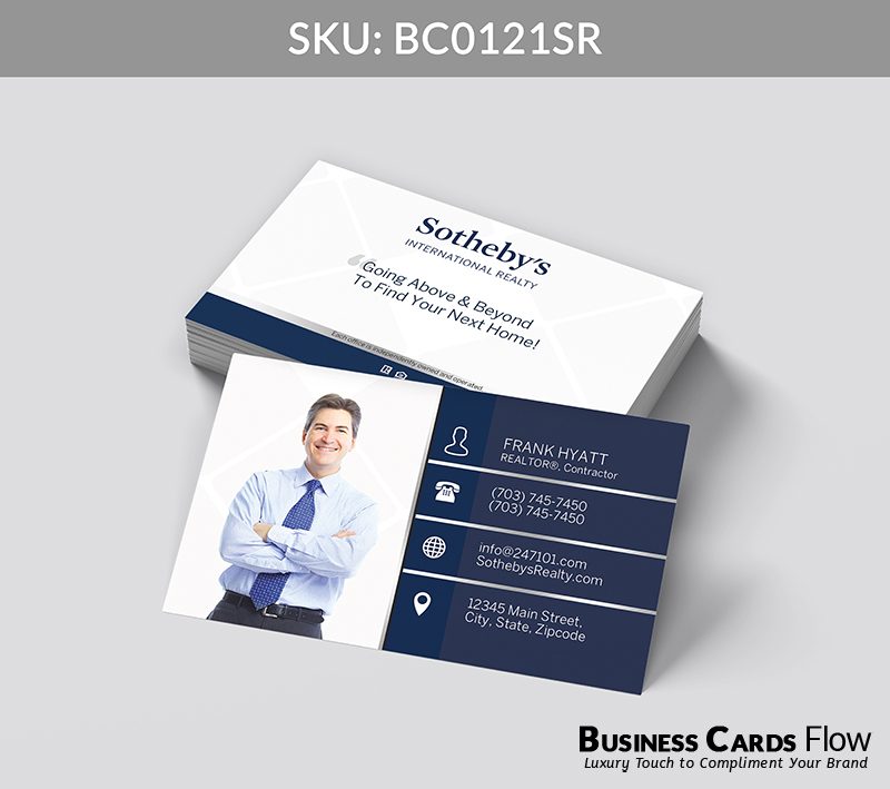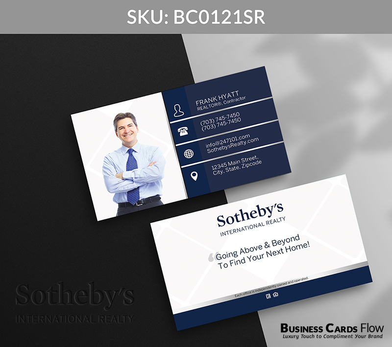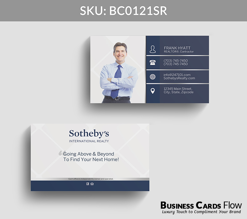 Your profile picture is featured on the left side of the business card, offering a personal and welcoming touch, while all of your contact information is displayed neatly and clearly on the right. The back of the card showcases the Sotheby’s International Realty logo with a designated space for a quote or slogan positioned thoughtfully at the bottom.