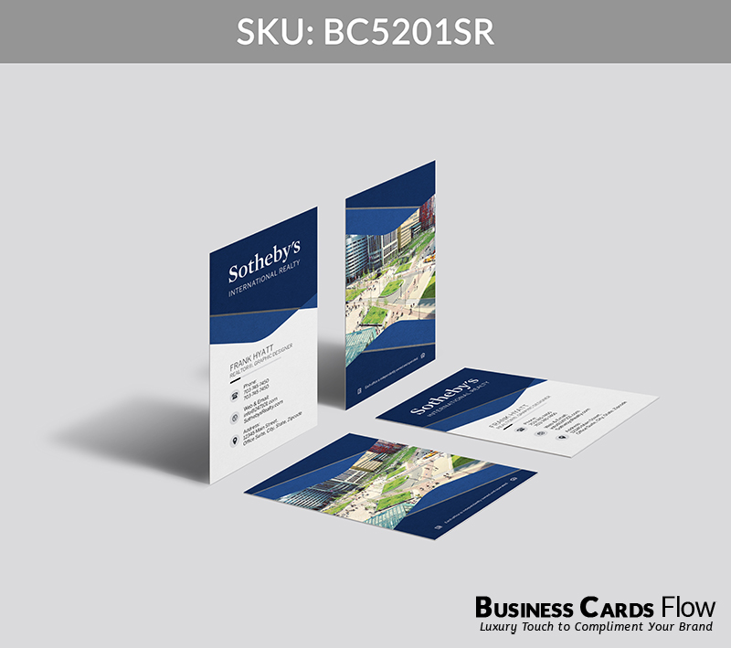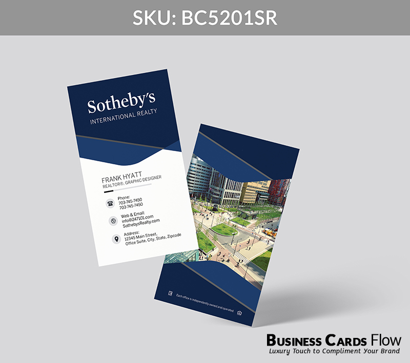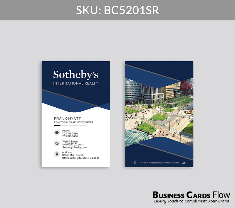 A: Absolutely — the vertical layout is both modern and enduring, while Sotheby’s International Realty’s Blue, Dark Blue, and White palette ensures your cards remain elegant, recognizable, and powerfully aligned with a globally trusted brand for years to come.