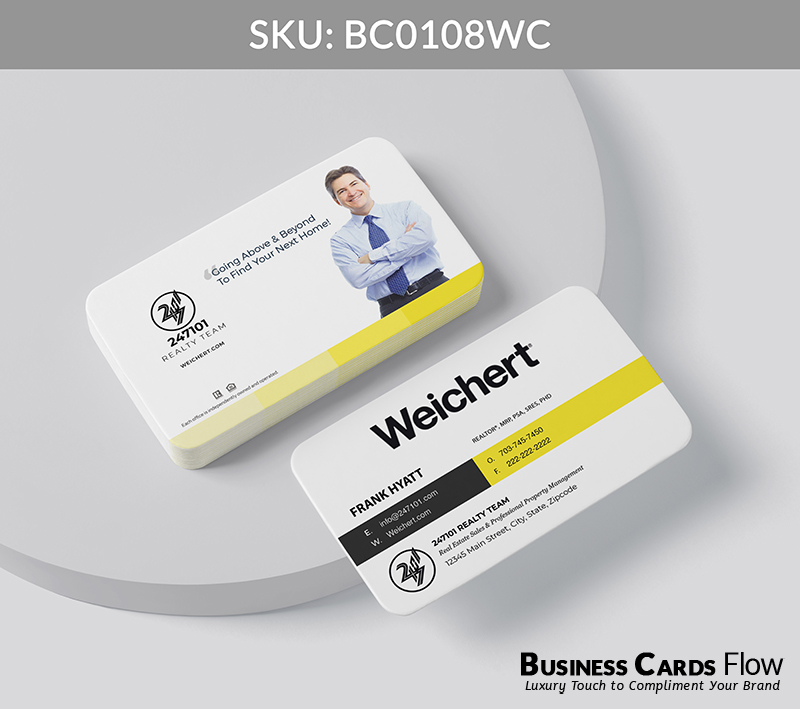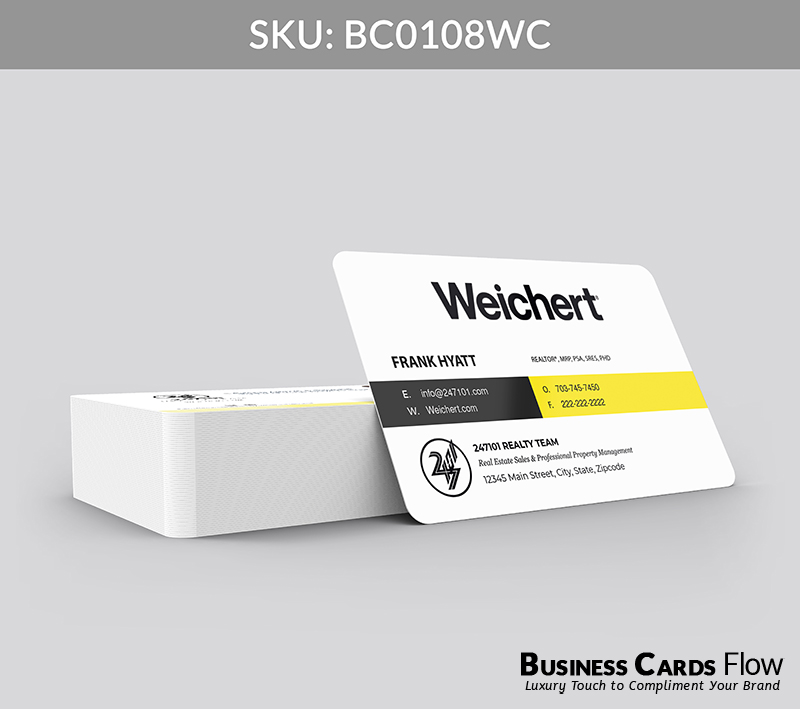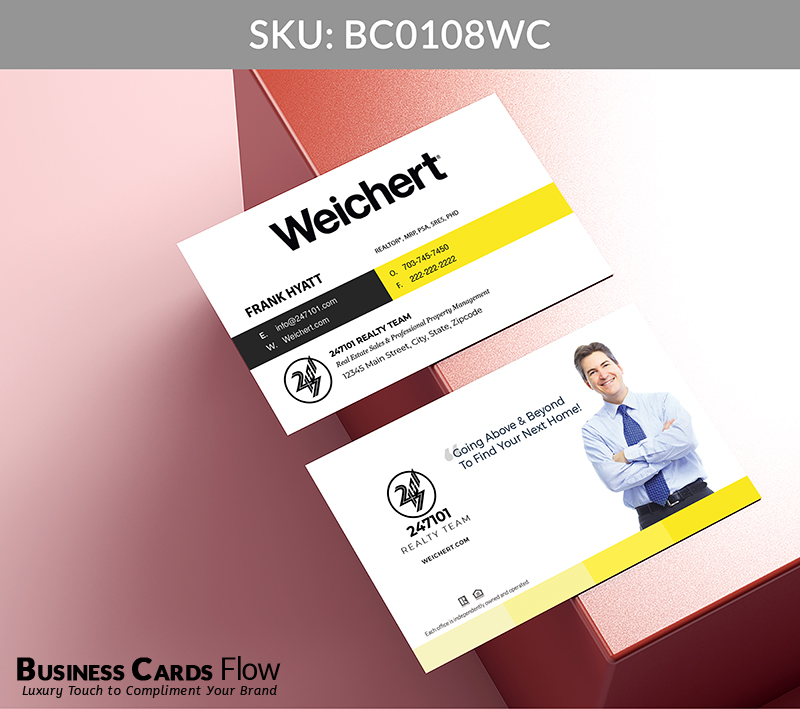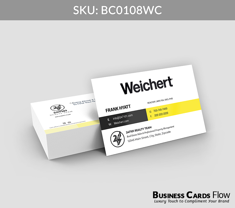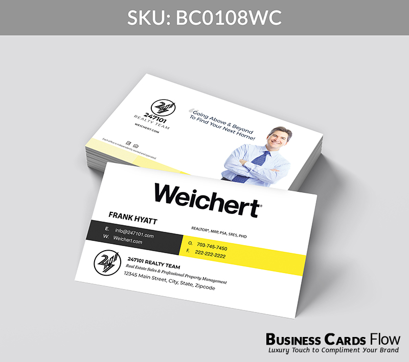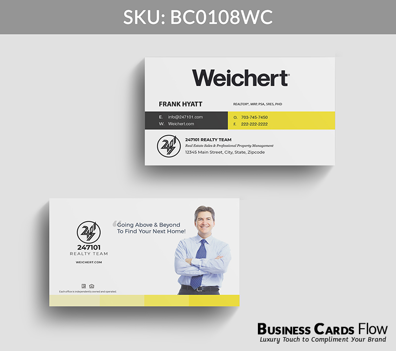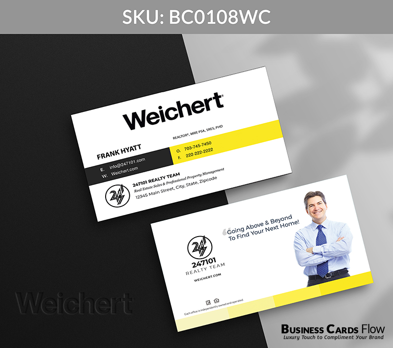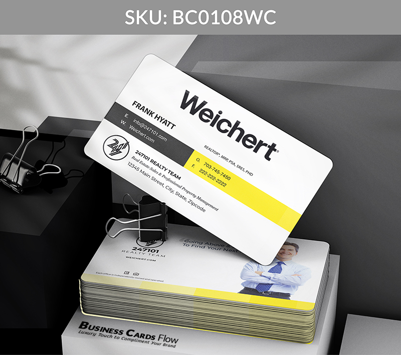 At your next buyer consultation, present a card that pairs clarity with confidence — showing you’re prepared, polished, and ready to serve. During listing appointments, a branded card that features your team’s photo or logo builds connection and familiarity. Consistent use of Weichert’s white, yellow, and black tones reinforces your affiliation with a name clients already trust.