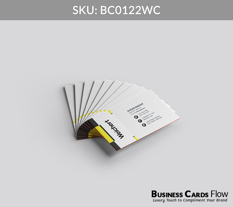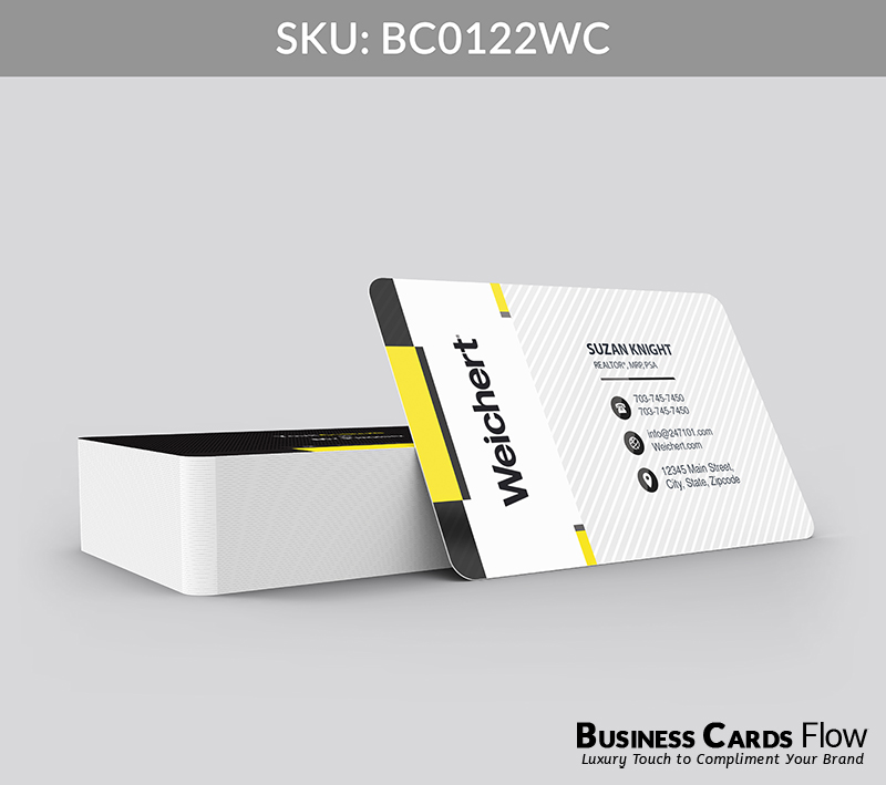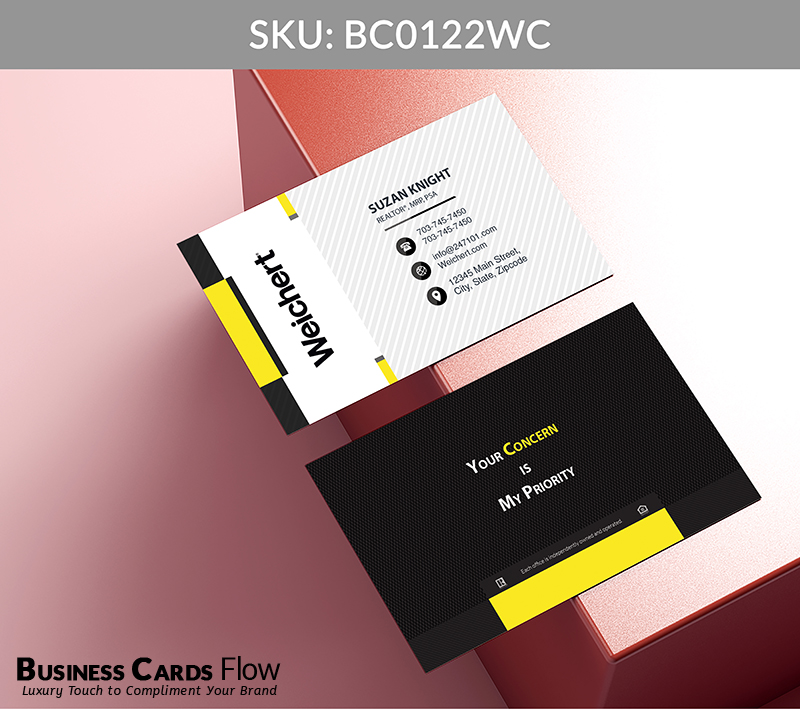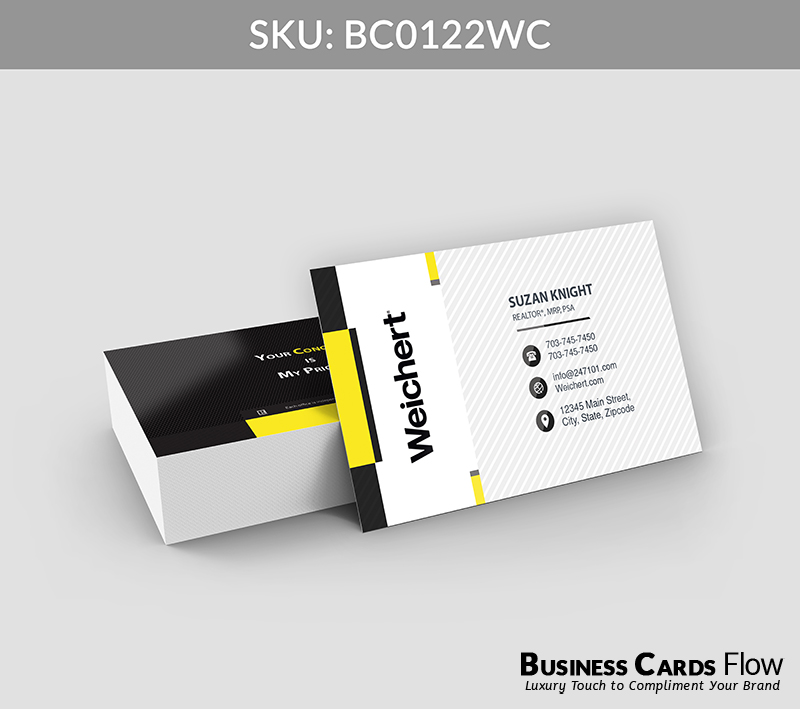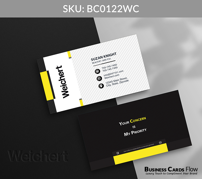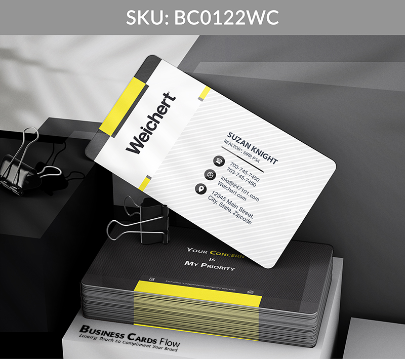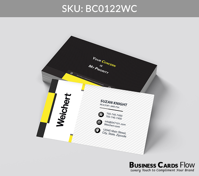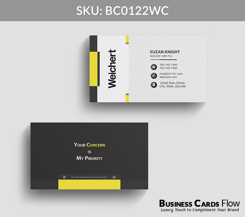 This design commands attention through contrast and confidence — a powerful card for agents who lead with clarity, purpose, and style. The balance of the textured front with the bold black back speaks directly to Weichert’s refined aesthetic, while the White, Yellow, and Black brand colors offer a foundation of trust and visual distinction.