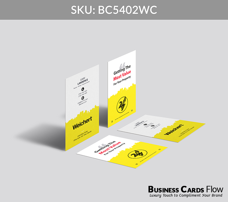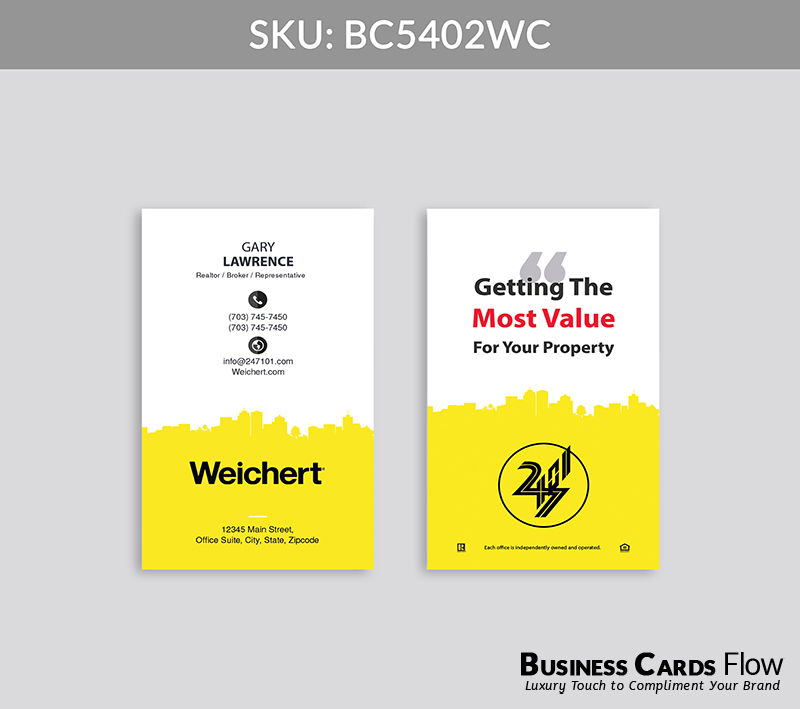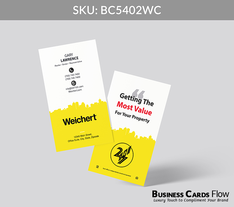 - Back design highlights the Weichert logo and office address, grounding every interaction in the strength of your brokerage’s identity.